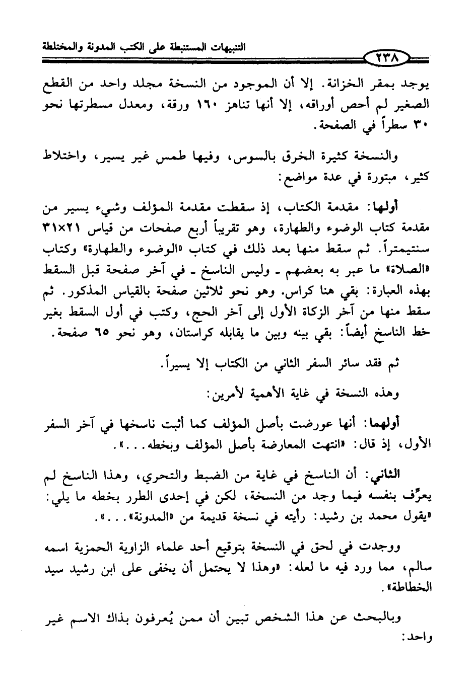 أولها: مقدمة الكتاب، إذ سقطت مقدمة المؤلف وشيء يسير من مقدمة كتاب الوضوء والطهارة، وهو تقريباً أربع صفحات من قياس 21 × 31 سنتيمتراً. ثم سقط منها بعد ذلك في كتاب "الوضوء والطهارة" وكتاب "الصلاة" ما عبر به بعضهم - وليس الناسخ - في آخر صفحة قبل السقط بهذه العبارة: بقي هنا كراس. وهو نحو ثلاثين صفحة بالقياس المذكور. ثم سقط منها من آخر الزكاة الأول إلى آخر الحج، وكتب في أول السقط بغير خط الناسخ أيضاً: بقي بينه وبين ما يقابله كراستان، وهو نحو 65 صفحة.