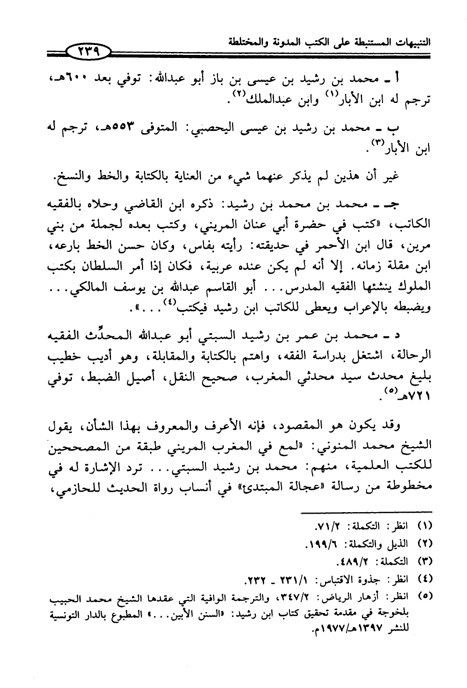 د - محمَّد بن عمر بن رشيد السبتي أبو عبد الله المحدِّث الفقيه الرحالة، اشتغل بدراسة الفقه، واهتم بالكتابة والمقابلة، وهو أديب خطيب بليغ محدث سيد محدثي المغرب، صحيح النقل، أصيل الضبط، توفي 721 هـ (¬5).