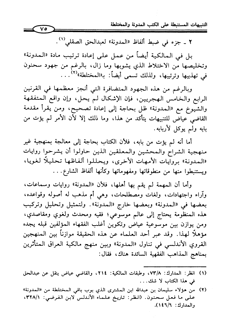 (¬2) من هؤلاء سليمان بن عبد الله ابن المشترى الذي بوب باقي المختلطة من "المدونة" على ما فعل سحنون. (انظر: تاريخ علماء الأندلس لابن الفرضي: 1/ 328، والمدارك: 6/ 146).