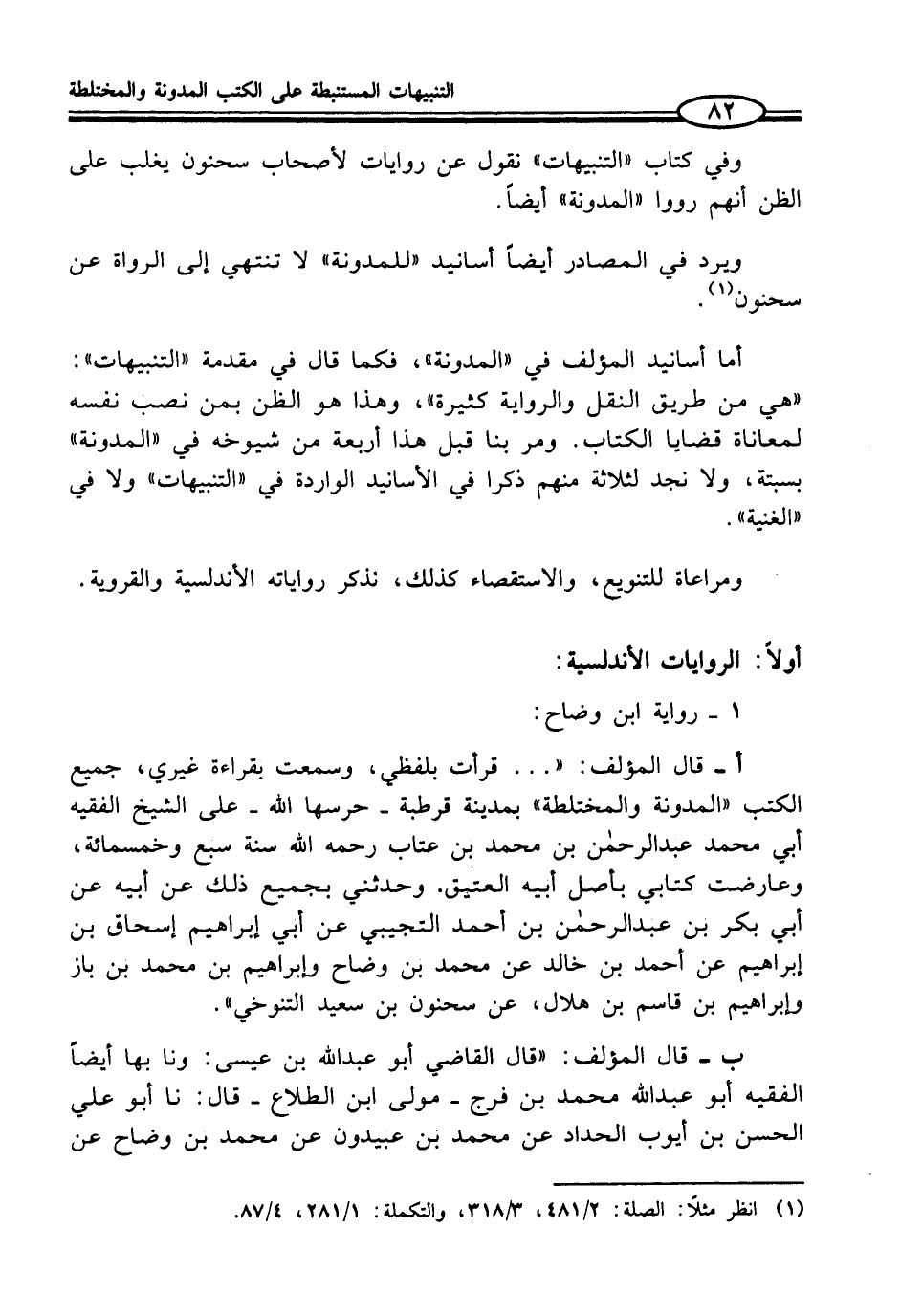 أ - قال المؤلف: " ... قرأت بلفظي، وسمعت بقراءة غيري، جميع الكتب "المدونة والمختلطة" بمدينة قرطبة - حرسها الله - على الشيخ الفقيه أبي محمَّد عبد الرحمن بن محمَّد بن عتاب رحمه الله سنة سبع وخمسمائة، وعارضت كتابي بأصل أبيه العتيق. وحدثني بجميع ذلك عن أبيه عن أبي بكر بن عبد الرحمن بن أحمد التجيبي عن أبي إبراهيم إسحاق بن إبراهيم عن أحمد بن خالد عن محمَّد بن وضاح وإبراهيم بن محمَّد بن باز وإبراهيم بن قاسم بن هلال، عن سحنون بن سعيد التنوخي".