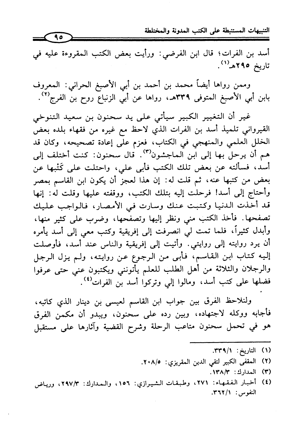 غير أن التغيير الكبير سيأتي على يد سحنون بن سعيد التنوخي القيرواني تلميذ أسد بن الفرات الذي لاحظ مع غيره من فقهاء بلده بعض الخلل العلمي والمنهجي في الكتاب، فعزم على إعادة تصحيحه، وكان قد هم أن يرحل بها إلى ابن الماجشون (¬3). قال سحنون: كنت أختلف إلى أسد، فسألته عن بعض تلك الكتب فأبى علي، واحتلت على كَتْبها عن بعض من كتبها عنه، ثم قلت له: إن هذا لعجز أن يكون ابن القاسم بمصر وأحتاج إلى أسد! فرحلت إليه بتلك الكتب، ووقفته عليها وقلت له: إنها قد أخذت الدنيا وكتبت عنك وسارت في الأمصار، فالواجب عليك تصفحها. فأخذ الكتب مني ونظر إليها وتصفحها، وضرب على كثير منها، وأبدل كثيراً، فلما تمت لي انصرفت إلى إفريقية وكتب معي إلى أسد يأمره أن يرد روايته إلى روايتي. وأتيت إلى إفريقية والناس عند أسد، فأوصلت إليه كتاب ابن القاسم، فأبى من الرجوع عن روايته، ولم يزل الرجل والرجلان والثلاثة من أهل الطلب للعلم يأتونني ويكتبون عني حتى عرفوا فضلها على كتب أسد، ومالوا إلي وتركوا أسد بن الفرات (¬4).