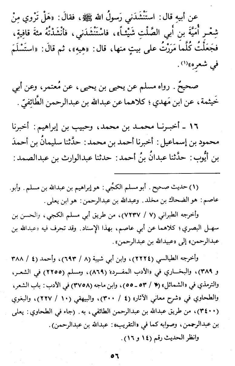 عَنْ أَبِيهِ قَالَ اسْتَنْشَدَنِي رَسُولُ اللَّهِ صَلَّى اللَّهُ عَلَيْهِ وَسَلَّمَ هَلْ تَرْوِي مِنْ شِعْرِ أُمَيَّةَ بْنِ أَبِي الصَّلْتِ شَيْئًا فَاسْتَنْشَدَنِي فَأَنْشَدته مئة قافية فَجعلت كلنا مَرَرْتُ عَلَى بَيْتٍ مِنْهَا قَالَ هِيهِ ثُمَّ قَالَ اسْتَسْلَمَ فِي شِعْرِهِ