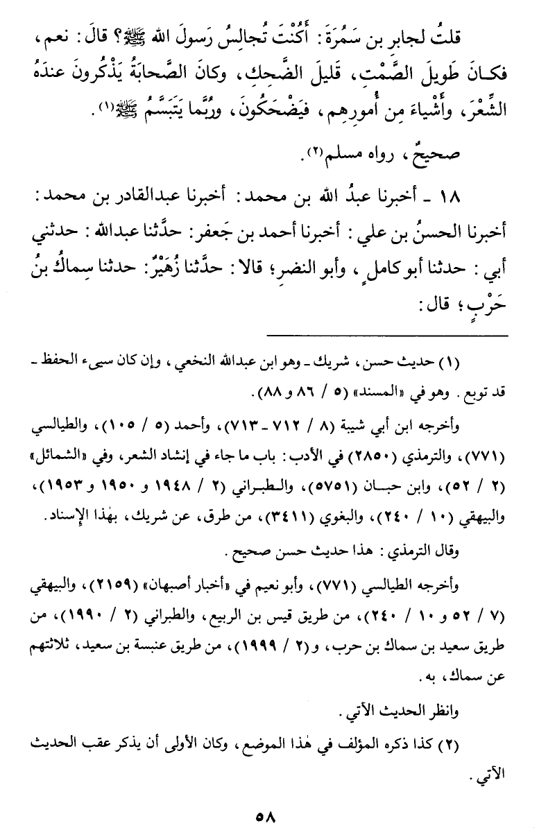 18 - أَخْبَرَنَا عَبْدُ اللَّهِ بْنُ مُحَمَّدٍ أَخْبَرَنَا عَبْدُ الْقَادِرِ بْنُ مُحَمَّدٍ أَخْبَرَنَا الْحَسَنُ بْنُ عَلِيٍّ أَخْبَرَنَا أَحْمَدُ بْنُ جَعْفَرٍ حُدَثَّنَا عَبْدُ اللَّهِ حَدَّثَنِي أَبِي حَدَّثَنَا أَبُو كَامِلٍ وَأَبُو النَّضْرِ قَالَا حَدَّثَنَا زُهَيْرٌ حَدَّثَنَا سِمَاكُ بْنُ حَرْبٍ قَالَ سَأَلْتُ جَابِرَ بْنُ سَمُرَةَ أَكُنْتَ تُجَالِسُ رَسُولَ اللَّهِ صَلَّى اللَّهُ عَلَيْهِ وَسَلَّمَ قَالَ نَعَمْ كَثِيرًا كَانَ لَا يَقُومُ مِنْ مُصَلَّاهُ الَّذِي يُصَلِّي فِيهِ الصُّبْحَ حَتَّى تَطْلُعَ الشَّمْسُ فَإِذَا طَلَعَتْ قَامَ وَكَانَ يُطِيلَ الصَّمْتَ فَيَتَحَدَّثُونَ فَيَأْخُذُونَ فِي أَمْرِ الْجَاهِلِيَّةِ فَيَضْحَكُونَ وَيَتَبَسَّمُ صَلَّى اللَّهُ عَلَيْهِ وَسَلَّمَ