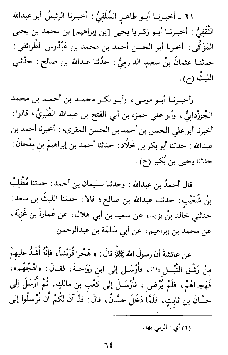 21 - أَخْبَرَنَا أَبُو طَاهِرٍ السِّلَفِيُّ أَخْبَرَنَا الرَّئِيسُ أَبُو عَبْدِ اللَّهِ الثَّقَفِيُّ أَخْبَرَنَا أَبُو زَكَرِيَّا يَحْيَى بْنُ إِبْرَاهِيمَ بْنِ مُحَمَّدِ بْنِ يَحْيَى الْمَزَكِّيُّ أَخْبَرَنَا أَبُو الْحَسَنِ أَحْمَدُ بْنُ مُحَمَّدِ بْنِ عَبْدُوسٍ الطَّرَائِفِيُّ حَدَّثَنَا عُثْمَانُ بْنُ سَعِيدٍ الدَّارِمِيُّ حَدَّثَنَا عَبْدُ اللَّهِ بْنُ صَالِحٍ حَدَّثَنِي اللَّيْثُ (ح) وأَخْبَرَنَا أَبُو مُوسَى وَأَبُو بَكْرٍ مُحَمَّدُ بْنُ أَحْمَدَ بْنِ مُحَمَّدٍ الجُوزْدَانِيُّ وَأَبُو عَلِيٍّ حَمْزَةُ بْنُ أَبِي الْفَتْحِ بْنِ عَبْدِ اللَّهِ الطَّبَرِيُّ قَالُوا أَخْبَرَنَا أَبُو عَلِيٍّ الْحَسَنُ بْنُ أَحْمد بن الْحسن القرىء أخْبرت أَحْمَدُ بْنُ عَبْدِ اللَّهِ حَدَّثَنَا أَبُو بَكْرِ بْنِ خَلَّادٍ حَدَّثَنَا أَحْمَدُ بْنُ إِبْرَاهِيمَ بْنِ مِلْحَانَ حَدَّثَنَا يَحْيَى بْنُ بُكَيْرٍ (ح) قَالَ أَحْمَدُ بْنُ عَبْدِ اللَّهِ وَحَدَّثَنَا سُلَيْمَانُ بْنُ أَحْمَدَ حَدَّثَنَا مُطَّلِبُ بْنُ شُعَيْبٍ حَدَّثَنَا عَبْدِ اللَّهِ بْنُ صَالِحٍ قَالَا حَدَّثَنَا اللَّيْثُ بْنُ سَعْدٍ حَدَّثَنِي خَالِدُ بْنُ يَزِيدَ عَنْ سَعِيدِ بْنِ أَبِي هِلَالٍ عَنْ عُمَارَةَ بْنِ غَزِيَّةَ عَنْ مُحَمَّدِ بْنِ إِبْرَاهِيمَ عَنْ أَبِي سَلَمَةَ بْنِ عَبْدِ الرَّحْمَنِ عَنْ عَائِشَةَ أَنَّ رَسُولَ اللَّهِ صَلَّى اللَّهُ عَلَيْهِ وَسَلَّمَ قَالَ اهْجُوا قُرَيْشًا فَإِنَّهُ أَشَدُّ عَلَيْهُمْ مِنْ رَشْقِ النَّبْلِ فَأَرْسَلَ إِلَى ابْنِ رَوَاحَةَ فَقَالَ اهْجُهُمْ فَهَجَاهُمْ فَلَمْ يُرْضِ فَأَرْسَلَ إِلَى كَعْبِ بْنِ مَالِكٍ ثُمَّ أَرْسَلَ إِلَى حَسَّانِ بْنِ ثَابِتٍ فَلَمَّا دَخَلَ حَسَّانٌ قَالَ قَدْ آنَ لَكُمْ أَنْ تُرْسِلُوا إِلَى