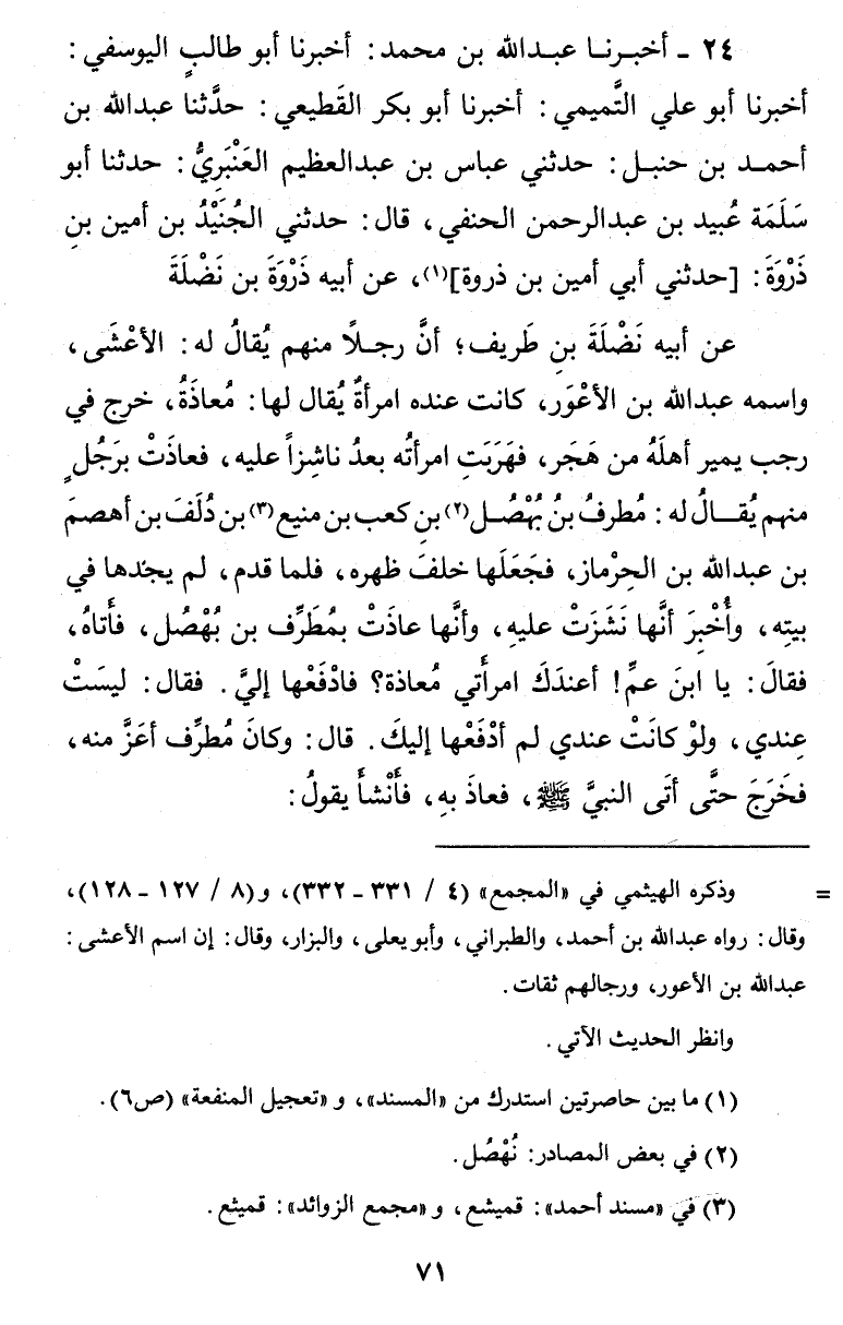24 - أَخْبَرَنَا عَبْدُ اللَّهِ بْنُ مُحَمَّدٍ أَخْبَرَنَا أَبُو طَالِبٍ الْيُوسُفِيُّ أَخْبَرَنَا أَبُو عَلِيٌّ التَّمِيمِيُّ أَخْبَرَنَا أَبُو بَكْرٍ الْقَطِيعِيُّ حَدَّثَنَا عَبْدُ اللَّهِ بْنُ أَحْمَدَ بْنِ حَنْبَلٍ حَدَّثَنِي عَبَّاسُ بْنُ عَبْدِ الْعَظِيمِ الْعَنْبَرِيُّ حَدَّثَنَا أَبِوُ سَلَمَةَ عُبَيْدُ بْنُ عَبْدِ الرَّحْمَنِ الْحَنَفِيُّ قَالَ حَدَّثَنِي الْجُنَيْدُ بْنُ أَمِينِ بْنِ ذَرْوَةَ حَدَّثَنِي أَبِي أَمِينُ بْنُ ذَرْوَةَ عَنْ أَبِيهِ ذَرْوَةَ بْنِ نَضْلَةَ عَنْ أَبِيهِ نَضْلَةَ بْنِ طَرِيفٍ أَنَّ رَجُلًا مِنْهُمْ يُقَالُ لَهُ الْأَعْشَى وَاسْمُهُ عَبْدُ اللَّهِ بْنُ الْأَعْوَرِ كَانَتَ عِنْدَهُ امْرَأَةٌ يُقَالُ لَهَا مُعَاذَةُ خَرَجَ فِي رَجَبٍ يَمِيرُ أَهْلَهُ مِنْ هَجَرَ فَهَرَبَتِ امْرَأَتُهُ بَعْدُ نَاشِزًا عَلَيْهِ فَعَاذَتْ بِرَجُلٍ مِنْهُمْ يُقَالُ لَهُ مُطَرِّفُ بْنُ بُهْصُلِ بْنِ كَعْبِ بْنِ مَنِيعِ بْنِ دُلَفَ بْنِ أَهْصَمَ بْنِ عَبْدِ اللَّهِ بْنِ الْحِرْمَازِ فَجَعَلَهَا خَلْفَ ظَهْرِهِ فَلَمَّا قَدِمَ لَمْ يَجِدْهَا فِي بَيْتِهِ وَأُخْبِرَ أَنَّهَا نَشَزَتْ عَلَيْهِ وَأَنَّهَا عَاذَتْ بِمُطَرِّفِ بْنُ بُهْصُلٍ فَأَتَاهُ فَقَالَ يَا ابْنَ عَمِّ أَعِنْدَكَ امْرَأَتِي مُعَاذَةُ فَادْفَعْهَا إِلَيَّ فَقَالَ لَيْسَتْ عِنْدِي وَلَوْ كَانَتْ عِنْدِي لَمْ أَدْفَعْهَا إِلَيْكَ قَالَ وَكَانَ مُطَرِّفٌ أَعَزَّ مِنْهُ فَخَرَجَ حَتَّى أَتَى النَّبِيِّ صَلَّى اللَّهُ عَلَيْهِ وَسَلَّمَ فَعَاذَ بِهِ فَأَنْشَأَ يَقُولُ