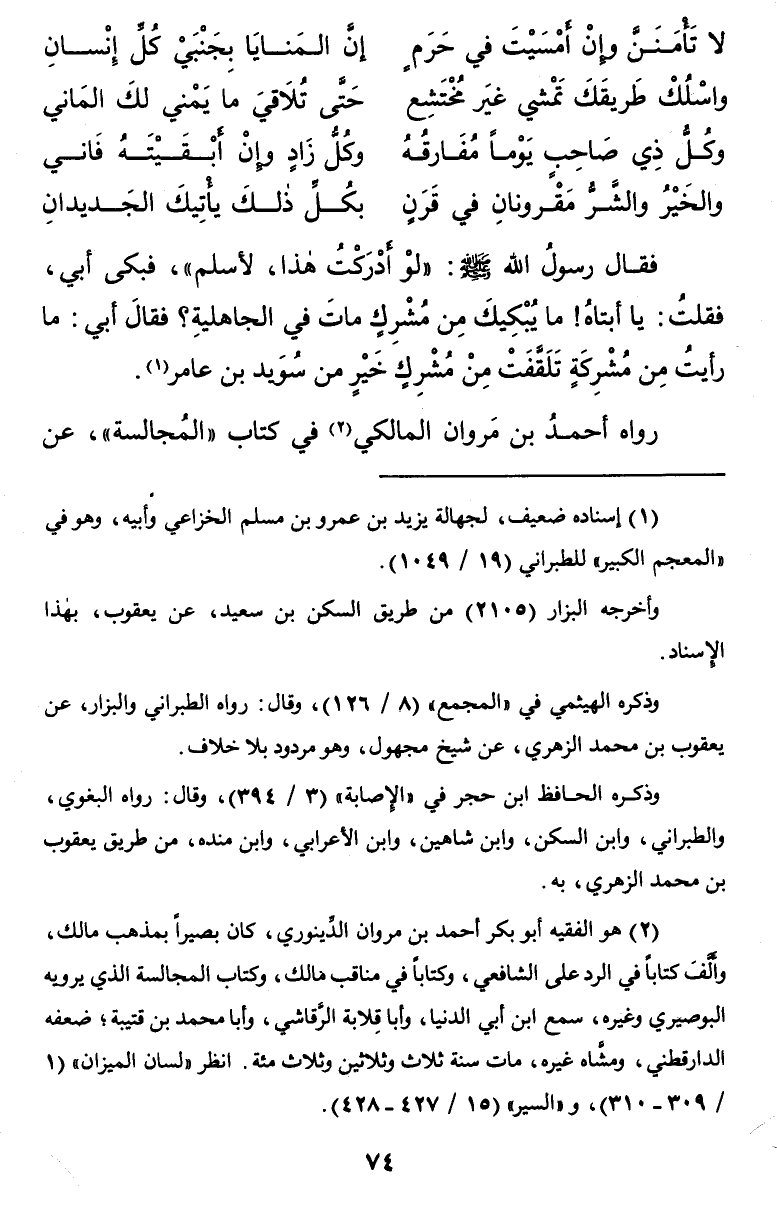 وَالْخَيْرُ وَالشَّرُّ مَقْرُونَانِ فِي قَرَنٍ ... بِكُلِّ ذَلِكَ يَأْتِيكَ الْجَدِيدَانِ ... فقَالَ رَسُولُ اللَّهِ صَلَّى اللَّهُ عَلَيْهِ وَسَلَّمَ لَوْ أَدْرَكْتُ هَذَا لَأَسْلَمَ فَبَكَى أَبِي فَقُلْتُ يَا أَبَتَاهُ مَا يُبْكِيكَ مِنْ مُشْرِكٍ مَاتَ فِي الْجَاهِلِيَّةِ فَقَالَ أَبِي مَا رَأَيْتُ مِنْ مُشْرِكَةٍ تَلَقَّفَتْ مِنْ مُشْرِكٍ خَيْرٍ مِنْ سُوَيْد بن عَامر