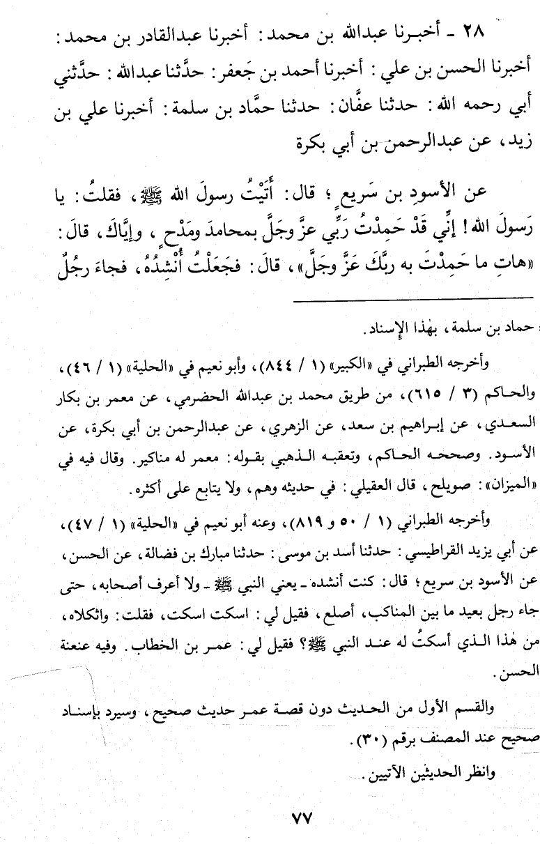 28 - أَخْبَرَنَا عَبْدُ اللَّهِ بْنُ مُحَمَّدٍ أَخْبَرَنَا عَبْدُ الْقَادِرِ بْنُ مُحَمَّدٍ أَخْبَرَنَا الْحَسَنُ بْنُ عَلِيٍّ أَخْبَرَنَا أَحْمَدُ بْنُ جَعْفَرٍ حُدَثَّنَا عَبْدُ اللَّهِ حَدَّثَنِي أَبِي رَحِمَهُ اللَّهُ حَدثنَا عَفَّان حَدثنَا حما بْنُ سَلَمَةَ أَخْبَرَنَا عَلِيُّ بْنُ زَيْدٍ عَنْ عَبْدِ الرَّحْمَنِ بْنِ أَبِي بَكْرَةَ عَنِ الأَسْوَدِ بْنِ سَرِيعٍ قَالَ أَتَيْتُ رَسُولَ اللَّهِ صَلَّى اللَّهُ عَلَيْهِ وَسَلَّمَ فَقُلْتُ يَا رَسُولَ اللَّهِ إِنِّي قَدْ حَمِدْتُ رَبِي عَزَّ وَجَلَّ بِمَحَامِدَ وَمَدْحٍ وَإِيَّاكَ قَالَ هَاتِ مَا حَمِدْتَ بِهِ رَبَّكَ عَزَّ وَجَلَّ قَالَ فَجَعَلْتُ أُنْشِدُهُ فَجَاءَ رَجُلٌ