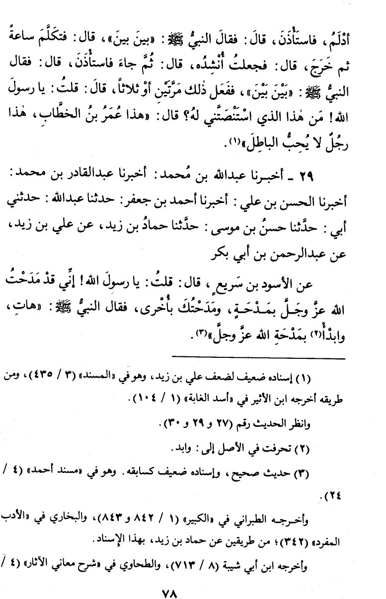 29 - أَخْبَرَنَا عَبْدُ اللَّهِ بْنُ مُحَمَّدٍ أَخْبَرَنَا عَبْدُ الْقَادِرِ بْنُ مُحَمَّدٍ أَخْبَرَنَا الْحَسَنُ بْنُ عَلِيٍّ أَخْبَرَنَا أَحْمَدُ بْنُ جَعْفَرٍ حُدَثَّنَا عَبْدُ اللَّهِ حَدَّثَنِي أَبِي حَدَّثَنَا حَسَنُ بْنُ مُوسَى حَدَّثَنَا حَمَّادُ بْنُ زَيْدٍ عَنْ عَلِيِّ بْنِ زَيْدٍ عَنْ عَبْدِ الرَّحْمَنِ بْنِ أَبِي بَكْرٍ عَنِ الْأَسْوَدِ بْنِ سَرِيعٍ قَالَ قَلْتُ يَا رَسُولَ اللَّهِ إِنِّي قَدْ مَدَحْتُ اللَّهَ عَزَّ وَجَلَّ بِمَدْحَةٍ وَمَدَحْتُكَ بِأُخْرَى فَقَالَ النَّبِيُّ صَلَّى اللَّهِ عَلَيْهِ وَسَلَّمَ هَاتِ وَابْدَأْ بِمَدْحَةِ اللَّهِ عَزَّ وَجَلَّ