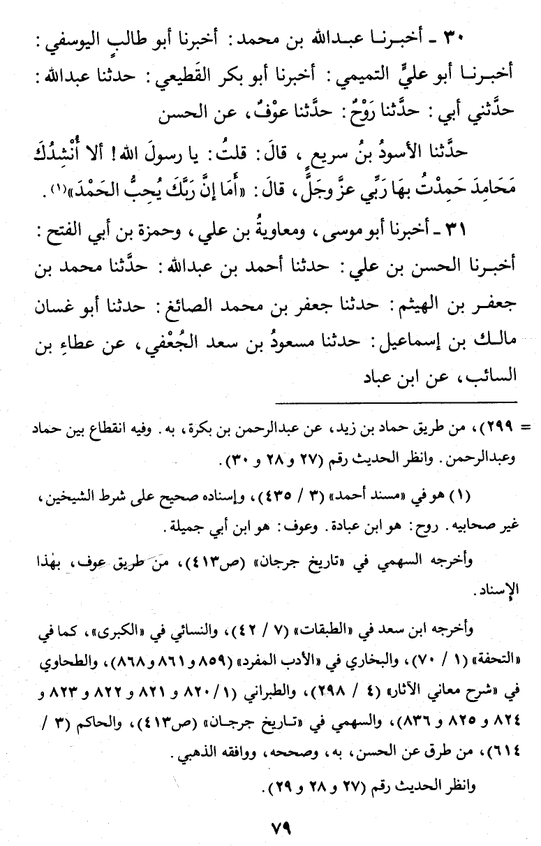 30 - أَخْبَرَنَا عَبْدُ اللَّهِ بْنُ مُحَمَّدٍ أَخْبَرَنَا أَبُو طَالِبٍ الْيُوسُفِيُّ أَخْبَرَنَا أَبُو عَلِيٌّ التَّمِيمِيُّ أَخْبَرَنَا أَبُو بَكْرٍ الْقَطِيعِيُّ حَدَّثَنَا عَبْدُ اللَّهِ حَدَّثَنِي أَبِي حَدَّثَنَا رَوْحٌ حَدَّثَنَا عَوْفٌ عَنِ الْحَسَنِ حَدَّثَنَا الْأَسْوَدُ بْنِ سَرِيعٍ قَالَ قَلْتُ يَا رَسُولَ اللَّهِ أَلَا أُنْشِدُكَ مَحَامِدَ حَمِدْتُ بِهَا رَبِّي عَزَّ وَجَلَّ قَالَ أَمَا إِنَّ رَبَّكَ يُحِبُّ الْحَمْدَ
