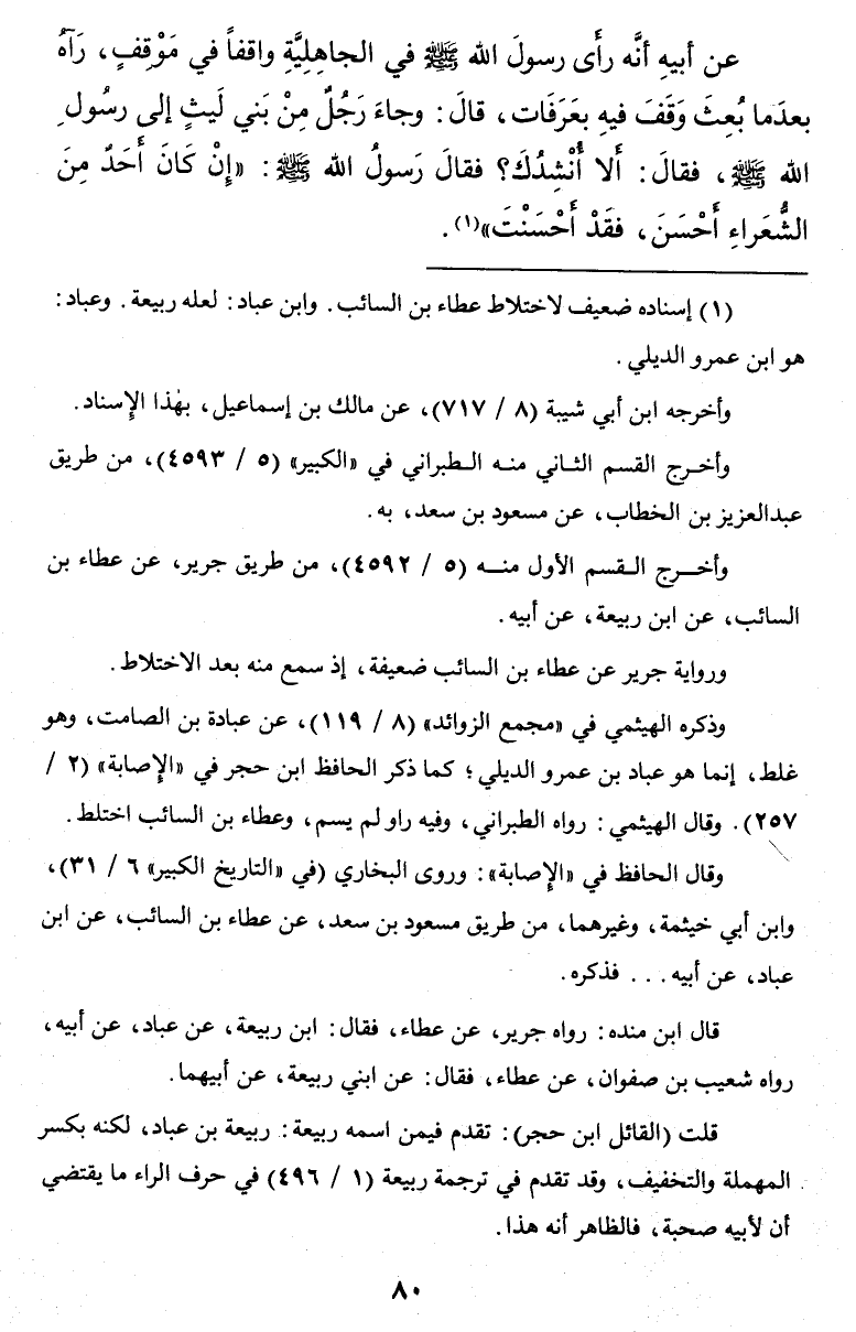 عَنْ أَبِيهِ أَنَّهُ رَأَى رَسُولَ اللَّهِ صَلَّى اللَّهُ عَلَيْهِ وَسَلَّمَ فِي الْجَاهِلِيَّةِ وَاقِفًا فِي مَوْقِفٍ رَآهُ بَعْدَمَا بُعِثَ وَقَفَ فِيهِ بِعَرَفَاتٍ قَالَ وَجَاءَ رَجُلٌ مِنْ بَنِي لَيْثٍ إِلَى رَسُولِ اللَّهِ صَلَّى اللَّهُ عَلَيْهِ وَسَلَّمَ فَقَالَ أَلَا أُنْشِدُكَ فَقَالَ رَسُولُ اللَّهِ صَلَّى اللَّهُ عَلَيْهِ وَسَلَّمَ إِنَّ كَانَ أَحَدٌ مِنَ الشُّعَرَاءِ أَحْسَنَ فَقَدْ أَحْسَنْتَ