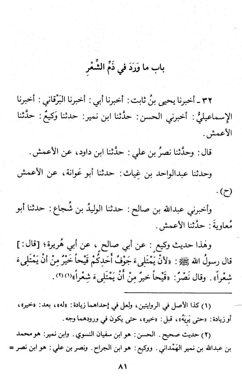 32 - أَخْبَرَنَا يَحْيَى بْنُ ثَابِتٍ أَخْبَرَنَا أَبِي أَخْبَرَنَا الْبَرْقَانِيُّ أَخْبَرَنَا الْإِسْمَاعِيلِيُّ أَخْبَرَنِي الْحَسَنُ حَدَّثَنَا ابْنُ نُمَيْرٍ حَدَّثَنَا وَكِيعٌ حَدَّثَنَا الْأَعْمَشُ قَالَ وَحَدَّثَنَا نَصْرُ بْنُ عَلِيٍّ حَدَّثَنَا ابْنُ دَاوُدَ عَنِ الْأَعْمَشِ وَحَدَّثَنَا عَبْدُ الْوَاحِدِ بْنِ غِيَاثٍ حَدَّثَنَا أَبُو عَوَانَةَ عَنِ الْأَعْمَشِ (ح) وَأَخْبَرَنِي عَبْدُ اللَّهِ بْنُ صَالِحٍ حَدَّثَنَا الْوَلِيدُ بْنُ شُجَاعٍ حَدَّثَنَا أَبُو مُعَاوِيَةَ حَدَّثَنَا الْأَعْمَشُ وَهَذَا حَدِيثُ وَكِيعٍ عَنْ أَبِي صَالِحٍ عَنْ أَبِي هُرَيْرَةَ قَالَ قَالَ رَسُولُ اللَّهِ صَلَّى اللَّهُ عَلَيْهِ وَسَلَّم لِأَنْ يَمْتَلِئَ جَوْفُ أَحَدِكُمْ قَيْحًا خَيْرٌ مِنْ أَنْ يَمْتَلِئَ شِعْرًا وَقَالَ نَصْرٌ قَيْحًا خَيْرٌ مِنْ أَنْ يَمْتَلِئَ شِعْرًا