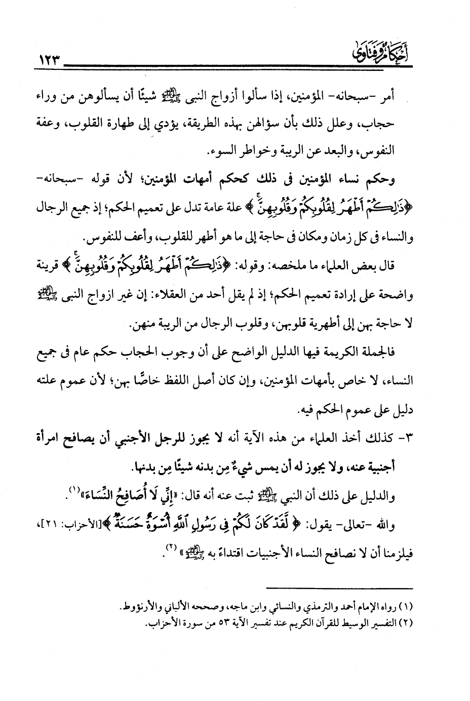 وحكم نساء المؤمنين فى ذلك كحكم أمهات المؤمنين، لأن قوله ـ سبحانه ـ {ذَلِكُمْ أَطْهَرُ لِقُلُوبِكُمْ وَقُلُوبِهِنَّ} علة عامة تدل على تعميم الحكم، إذ جميع الرجال والنساء فى كل زمان ومكان فى حاجة إلى ما هو أطهر للقلوب، وأعف للنفوس.
