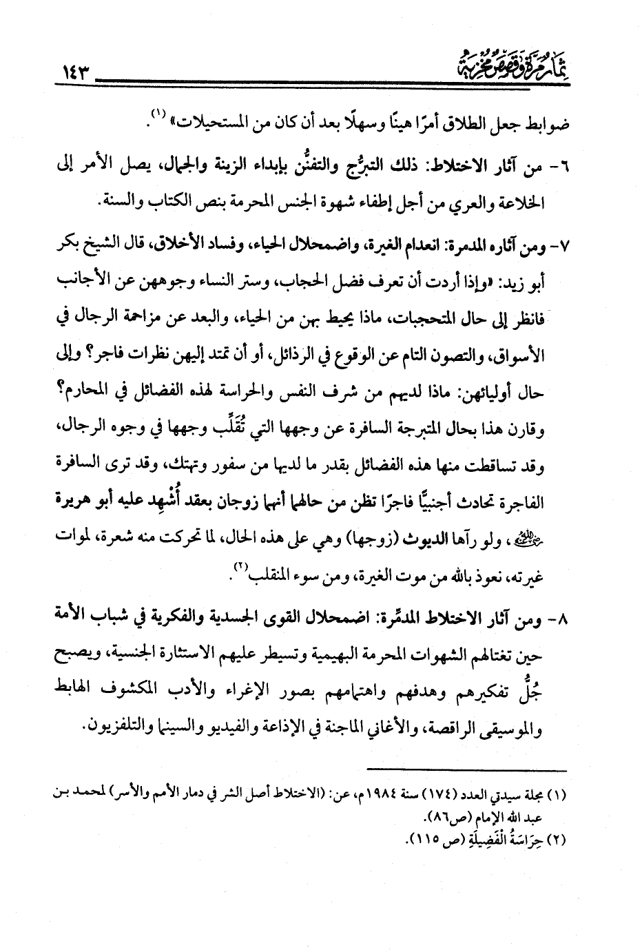 (¬1) مجلة سيدتي العدد (174) سنة 1984 م، عن (الاختلاط أصل الشر في دمار الأمم والأسر) لمحمد بن عبد الله الإمام (ص86).