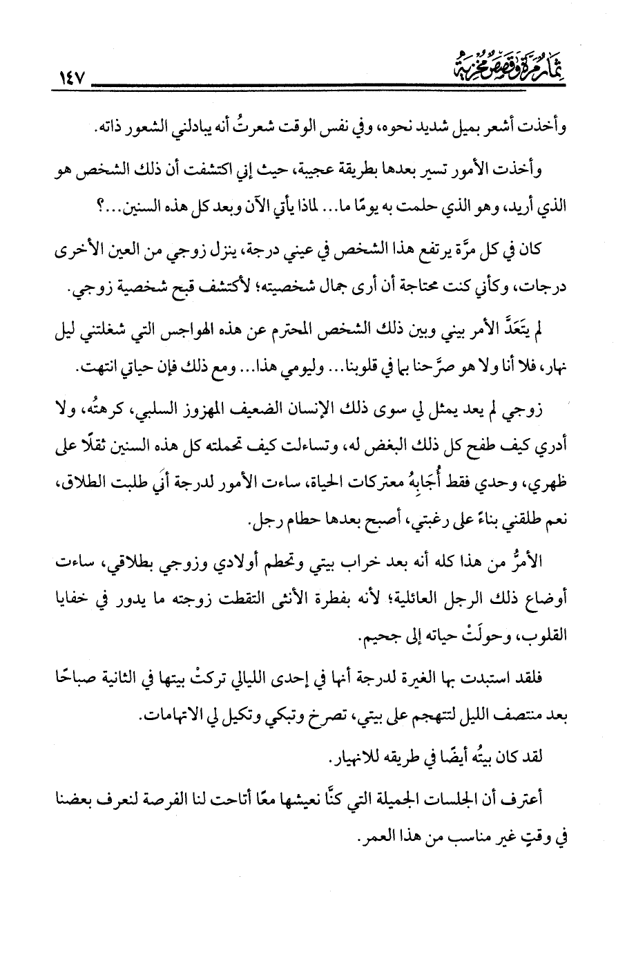 الأمرّ من هذا كله أنه بعد خراب بيتي وتحطم أولادي وزوجي بطلاقي، ساءت أوضاع ذلك الرجل العائلية لأنه بفطرة الأنثى التقطت زوجته ما يدور في خفايا القلوب، وحولَتْ حياته إلى جحيم.