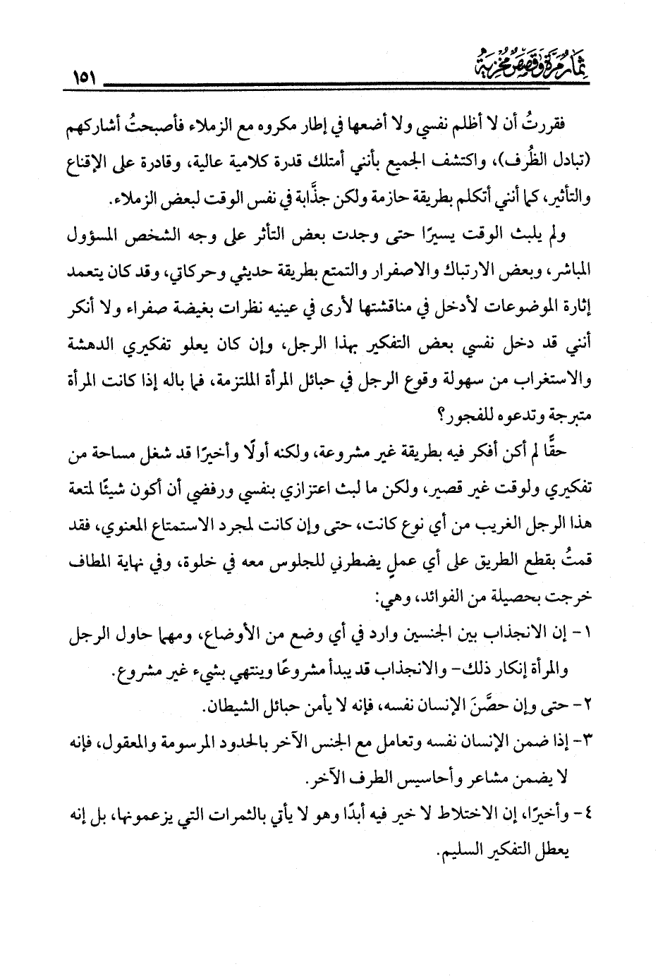 ولم يلبث الوقت يسيرًا حتى وجدت بعض التأثر على وجه الشخص المسؤول المباشر وبعض الارتباك والاصفرار والتمتع بطريقة حديثي وحركاتي وقد كان يتعمد إثارة الموضوعات لأدخل في مناقشتها لأرى في عينيه نظرات بغيضة صفراء ولا أنكر أنني قد دخل نفسي بعض التفكير بهذا الرجل، وإن كان يعلو تفكيري الدهشة والاستغراب من سهولة وقوع الرجل في حبائل المرأة الملتزمة، فما باله إذا كانت المرأة متبرجة وتدعوه للفجور؟