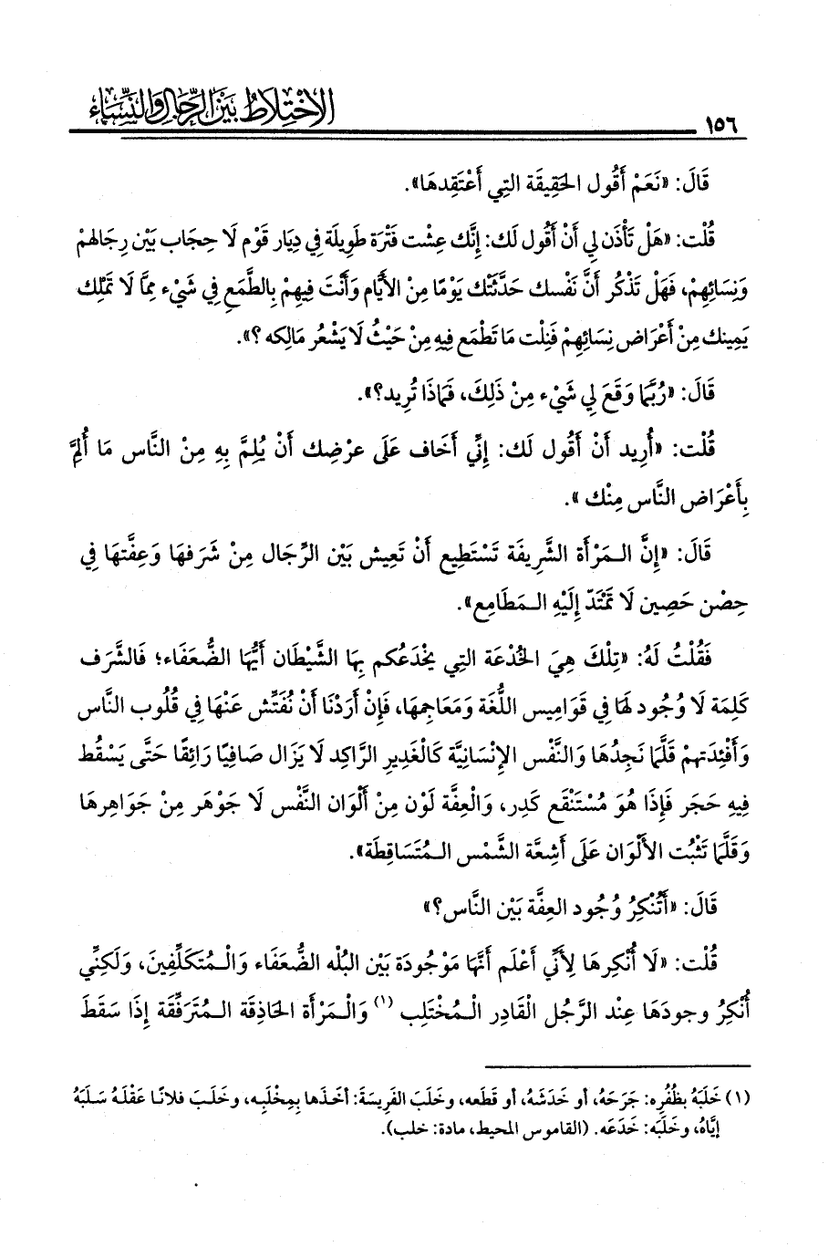 قُلْت: «هَلْ تَأْذَن لِي أَنْ أَقُول لَك إِنَّك عِشْت فَتْرَة طَوِيلَة فِي دِيَار قَوْم لَا حِجَاب بَيْن رِجَالهمْ وَنِسَائِهِمْ فَهَلْ تَذْكُر أَنَّ نَفْسك حَدَّثَتْك يَوْمًا مِنْ الأَيَّام وَأَنْتَ فِيهِمْ بِالطَّمَعِ فِي شَيْء مِمَّا لَا تَمْلِك يَمِينك مِنْ أَعْرَاض نِسَائِهِمْ فَنِلْت مَا تَطْمَع فِيهِ مِنْ حَيْثُ لَا يَشْعُر مَالِكه؟».
