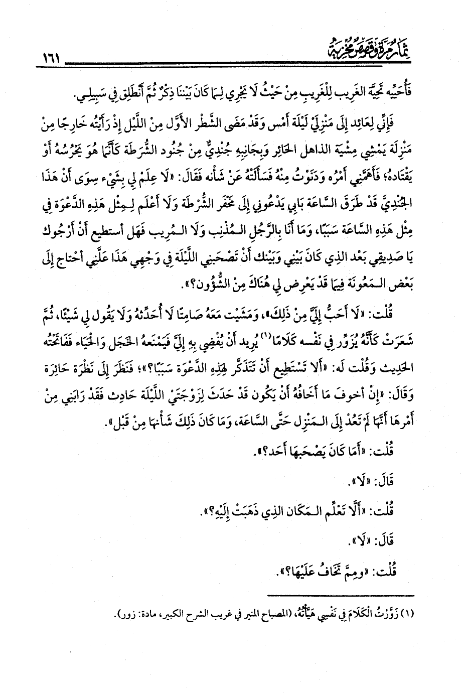 قُلْت: «لَا أَحَبّ إِلَيَّ مِنْ ذَلِكَ»، وَمَشَيْت مَعَهُ صَامِتًا لَا أُحَدِّثهُ وَلَا يَقُول لِي شَيْئًا ثُمَّ شَعَرَتْ كَأَنَّهُ يُزَوِّر فِي نَفْسه كَلَامًا (¬1) يُرِيد أَنْ يُفْضِي بِهِ إِلَيَّ فَيَمْنَعهُ الخَجَل وَالْحَيَاء فَفَاتَحْتُه الحَدِيث وَقُلْت لَه: «أَلَّا تَسْتَطِيع أَنْ تَتَذَكَّر لِهَذِهِ الدَّعْوَة سَبَبًا؟»؛ فَنَظَرَ إِلَى نَظْرَة حَائِرَة وَقَالَ: «إِنْ أُخَوِّف مَا أَخَافَهُ أَنْ يَكُون قَدْ حَدَثَ لِزَوْجَتَيْ اللَّيْلَة حَادِث فَقَدْ رَابَنِي مِنْ أَمْرهَا أَنَّهَا لَمْ تَعُدْ إِلَى المَنْزِل حَتَّى السَّاعَة، وَمَا كَانَ ذَلِكَ شَأْنهَا مِنْ قَبْل».