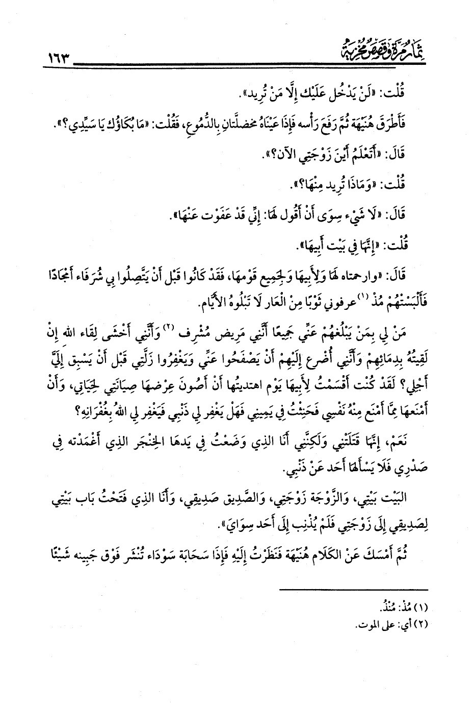 مَنْ لِي بِمَنْ يَبْلُغهُمْ عَنِّي جَمِيعًا أَنَّنِي مَرِيض مُشْرِف (¬2) وَأَنَّنِي أَخْشَى لِقَاء اللهِ إِنْ لَقِيتُهُ بِدِمَائِهِمْ وَأَنَّنِي أُضْرع إِلَيْهِمْ أَنْ يَصْفَحُوا عَنِّي وَيَغْفِرُوا زَلَّتِي قَبْل أَنْ يَسْبِق إِلَيَّ أَجْلِي؟ لَقَدْ كُنْت أَقْسَمْتُ لِأَبِيهَا يَوْم اهتديتُها أَنْ أَصُونَ عِرْضهَا صِيَانَتِي لِحَيَاتِي وَأَنْ أَمْنَعهَا مِمَّا أَمْنَع مِنْهُ نَفْسِيّ فَحَنِثْتُ فِي يَمِينِي فَهَلْ يَغْفِر لِي ذَنْبِي فَيَغْفِر لِي اللهُ بِغُفْرَانِهِ؟