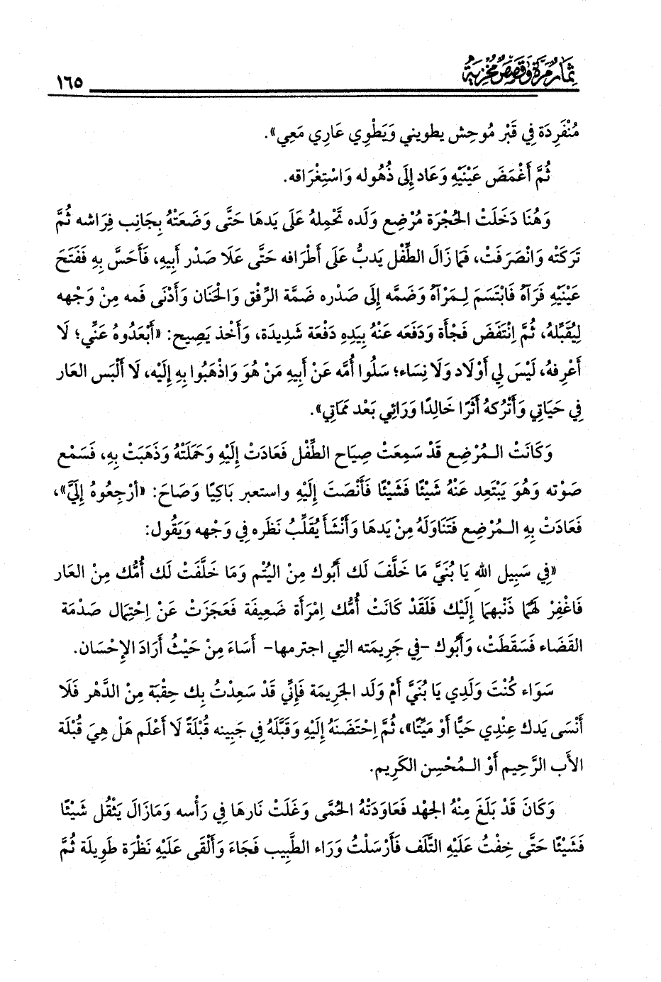 وَهُنَا دَخَلَتْ الحُجْرَة مُرْضِع وَلَده تَحْمِلهُ عَلَى يَدهَا حَتَّى وَضَعَتْهُ بِجَانِب فِرَاشه ثُمَّ تَرَكَتْه وَانْصَرَفَتْ، فَمَا زَالَ الطِّفْل يَدبّ عَلَى أَطْرَافه حَتَّى عَلَا صَدْر أَبِيهِ، فَأَحَسَّ بِهِ فَفَتَحَ عَيْنَيْهِ فَرَآهُ فَابْتَسَمَ لِمَرْآهُ وَضَمّه إِلَى صَدْره ضَمَّة الرِّفْق وَالْحَنَان وَأَدْنَى فَمه مِنْ وَجْهه لِيُقَبِّلهُ ثُمَّ اِنْتَفَضَ فَجْأَة وَدَفَعَه عَنْهُ بِيَدِهِ دَفْعَة شَدِيدَة، وَأَخْذ يَصِيح: «أَبْعَدُوهُ عَنِّي؛ لَا أَعْرِفهُ، لَيْسَ لِي أَوْلَاد وَلَا نِسَاء؛ سَلُوا أُمّه عَنْ أَبِيهِ مَنْ هُوَ وَاذْهَبُوا بِهِ إِلَيْه، لَا أَلْبَس العَار فِي حَيَاتِي وَأَتْرُكهُ أَثَرًا خَالِدًا وَرَائِي بَعْد مَمَاتِي».