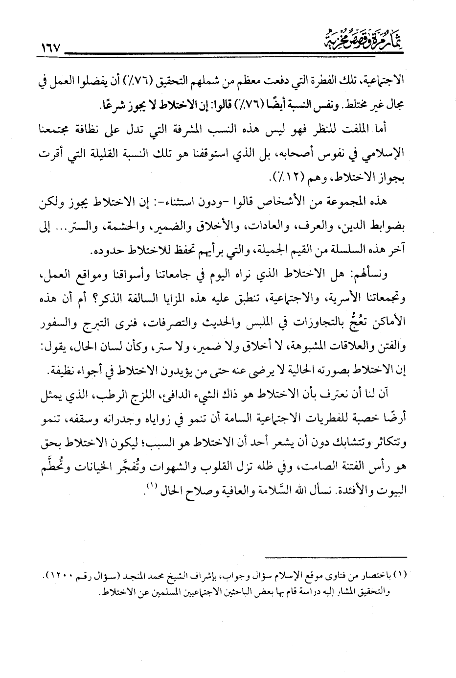 (¬1) باختصار من فتاوى موقع الإسلام سؤال وجواب، بإشراف الشيخ محمد المنجد، (سؤال رقم 1200). والتحقيق المشار إليه دراسة قام بها بعض الباحثين الاجتماعيين المسلمين عن الاختلاط.