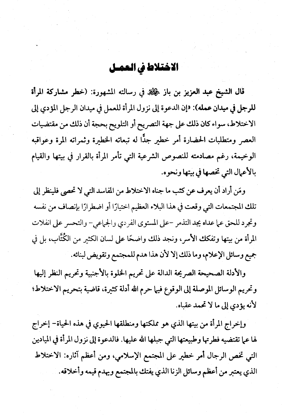 قال الشيخ عبد العزيز بن باز - رحمه الله - في رسالته المشهورة (خطر مشاركة المرأة للرجل في ميدان عمله): «إن الدعوة إلى نزول المرأة للعمل في ميدان الرجل المؤدي إلى الاختلاط سواء كان ذلك على جهة التصريح أو التلويح بحجة أن ذلك من مقتضيات العصر ومتطلبات الحضارة أمر خطير جدًا له تبعاته الخطيرة وثمراته المرة وعواقبه الوخيمة، رغم مصادمته للنصوص الشرعية التي تأمر المرأة بالقرار في بيتها والقيام بالأعمال التي تخصها في بيتها ونحوه.