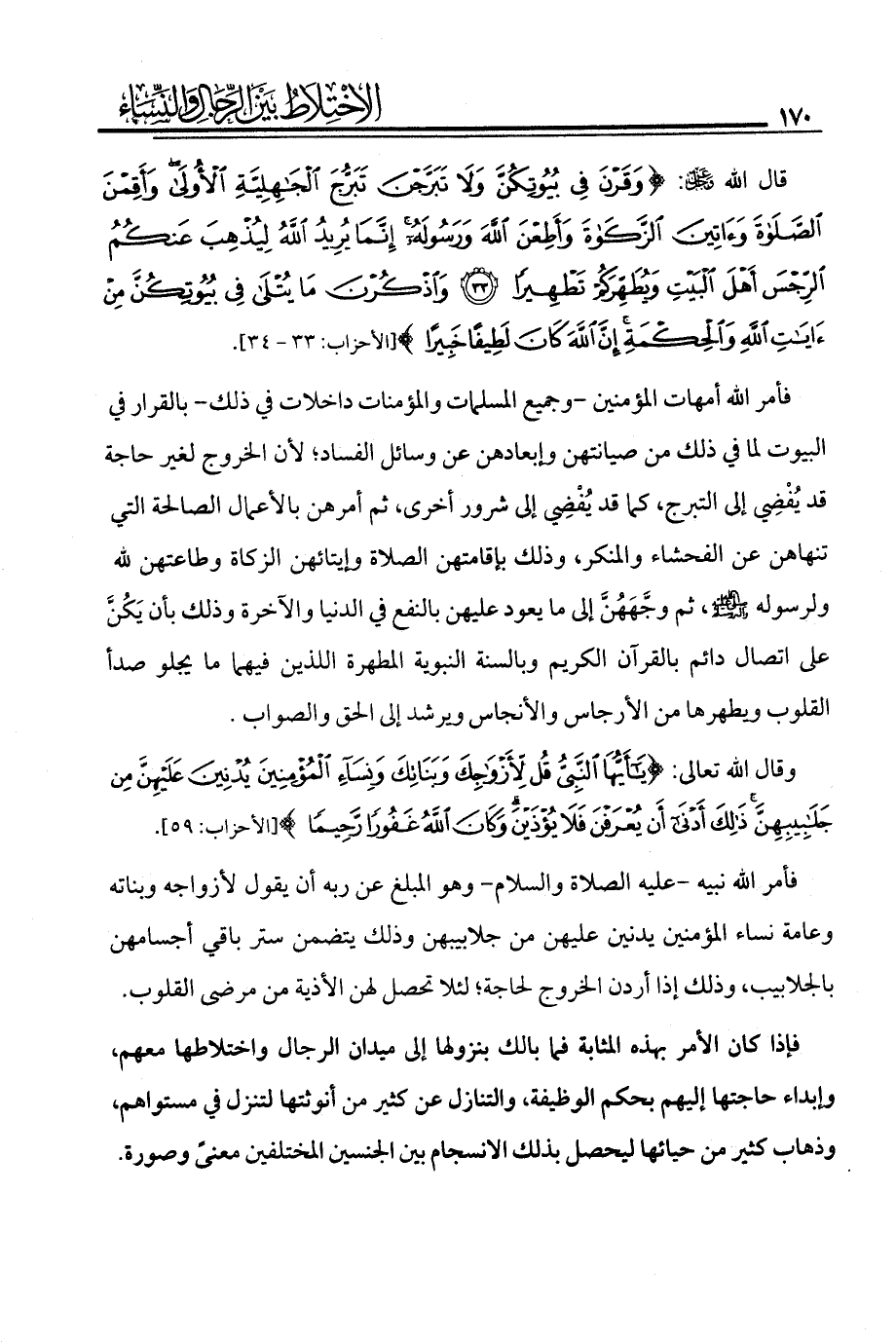 قال الله - عز وجل -: {وَقَرْنَ فِي بُيُوتِكُنَّ وَلَا تَبَرَّجْنَ تَبَرُّجَ الْجَاهِلِيَّةِ الْأُولَى وَأَقِمْنَ الصَّلَاةَ وَآتِينَ الزَّكَاةَ وَأَطِعْنَ اللَّهَ وَرَسُولَهُ إِنَّمَا يُرِيدُ اللَّهُ لِيُذْهِبَ عَنْكُمُ الرِّجْسَ أَهْلَ الْبَيْتِ وَيُطَهِّرَكُمْ تَطْهِيرًا (33) وَاذْكُرْنَ مَا يُتْلَى فِي بُيُوتِكُنَّ مِنْ آيَاتِ اللَّهِ وَالْحِكْمَةِ إِنَّ اللَّهَ كَانَ لَطِيفًا خَبِيرًا (34)} (الأحزاب: 33 - 34).