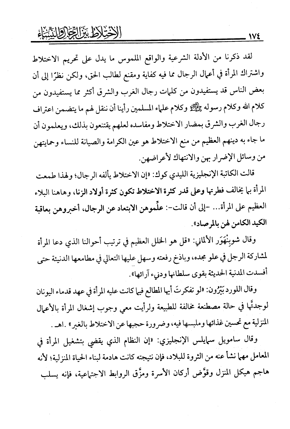 لقد ذكرنا من الأدلة الشرعية والواقع الملموس ما يدل على تحريم الاختلاط واشتراك المرأة في أعمال الرجال مما فيه كفاية ومقنع لطالب الحق، ولكن نظرًا إلى أن بعض الناس قد يستفيدون من كلمات رجال الغرب والشرق أكثر مما يستفيدون من كلام الله وكلام رسوله - صلى الله عليه وآله وسلم - وكلام علماء المسلمين رأينا أن ننقل لهم ما يتضمن اعتراف رجال الغرب والشرق بمضار الاختلاط ومفاسده لعلهم يقتنعون بذلك، ويعلمون أن ما جاء به دينهم العظيم من منع الاختلاط هو عين الكرامة والصيانة للنساء وحمايتهن من وسائل الإضرار بهن والانتهاك لأعراضهن.