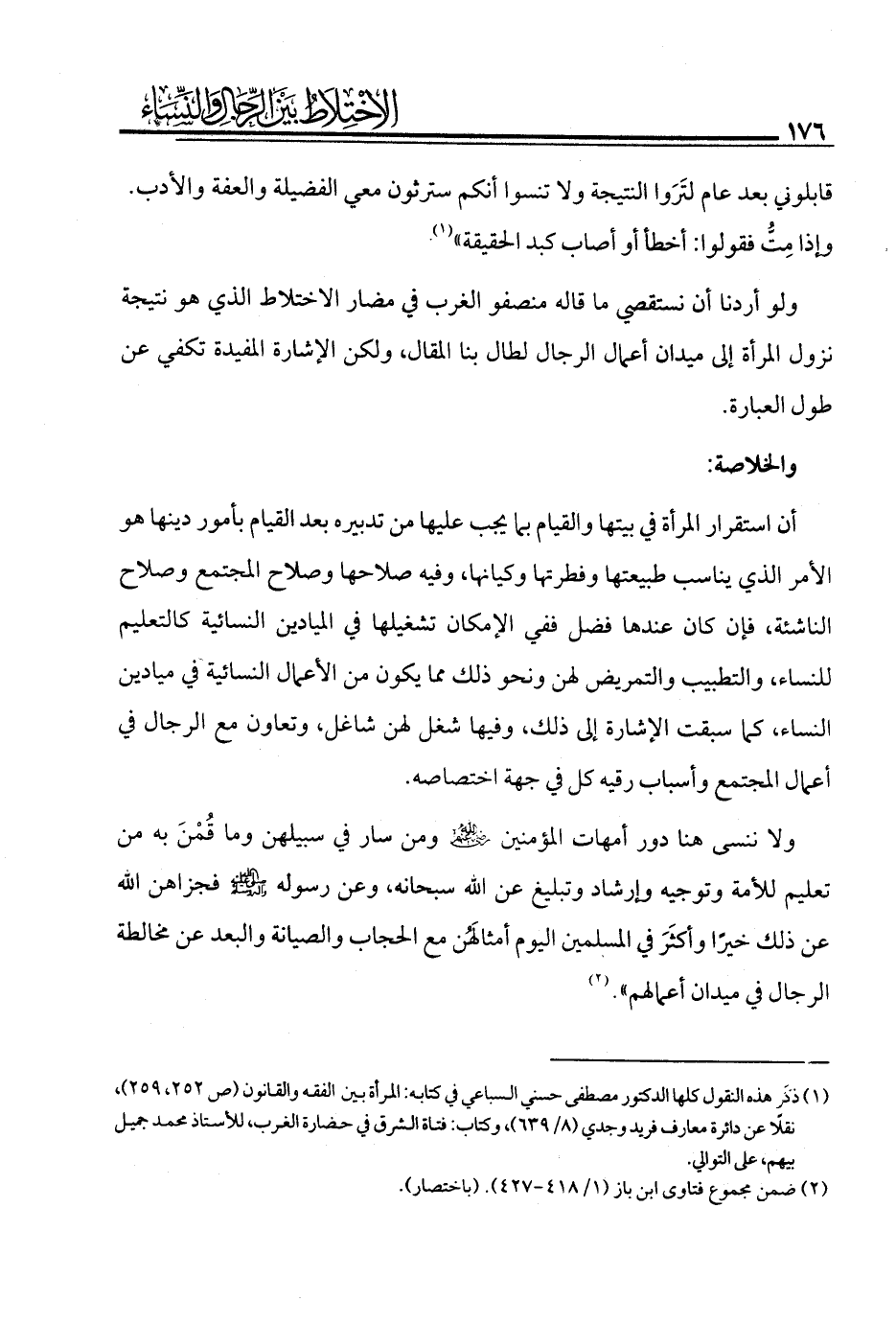 ولو أردنا أن نستقصي ما قاله منصفو الغرب في مضار الاختلاط الذي هو نتيجة نزول المرأة إلى ميدان أعمال الرجال لطال بنا المقال ولكن الإشارة المفيدة تكفي عن طول العبارة.