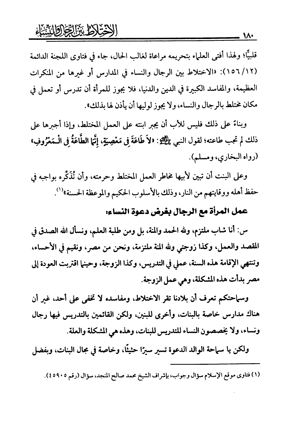 قلبيًا، ولهذا أفتى العلماء بتحريمه مراعاة لغالب الحال، جاء في فتاوى اللجنة الدائمة (12/ 156): «الاختلاط بين الرجال والنساء في المدارس أو غيرها من المنكرات العظيمة، والمفاسد الكبيرة في الدين والدنيا، فلا يجوز للمرأة أن تدرس أو تعمل في مكان مختلط بالرجال والنساء، ولا يجوز لوليها أن يأذن لها بذلك».