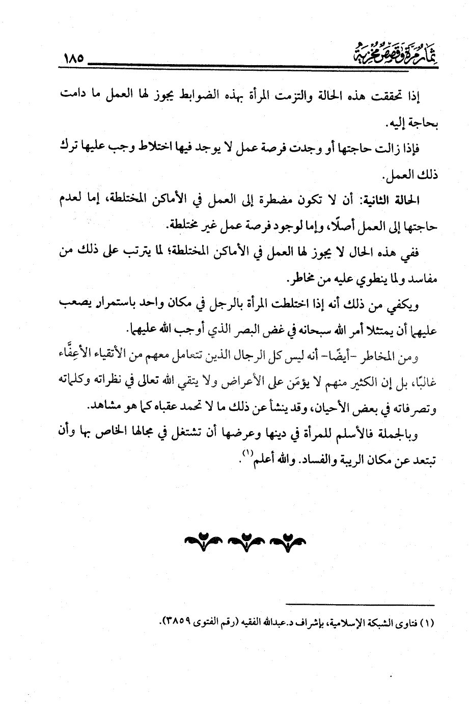 الحالة الثانية: أن لا تكون مضطرة إلى العمل في الأماكن المختلطة إما لعدم حاجتها إلى العمل أصلًا، وإما لوجود فرصة عمل غير مختلطة.