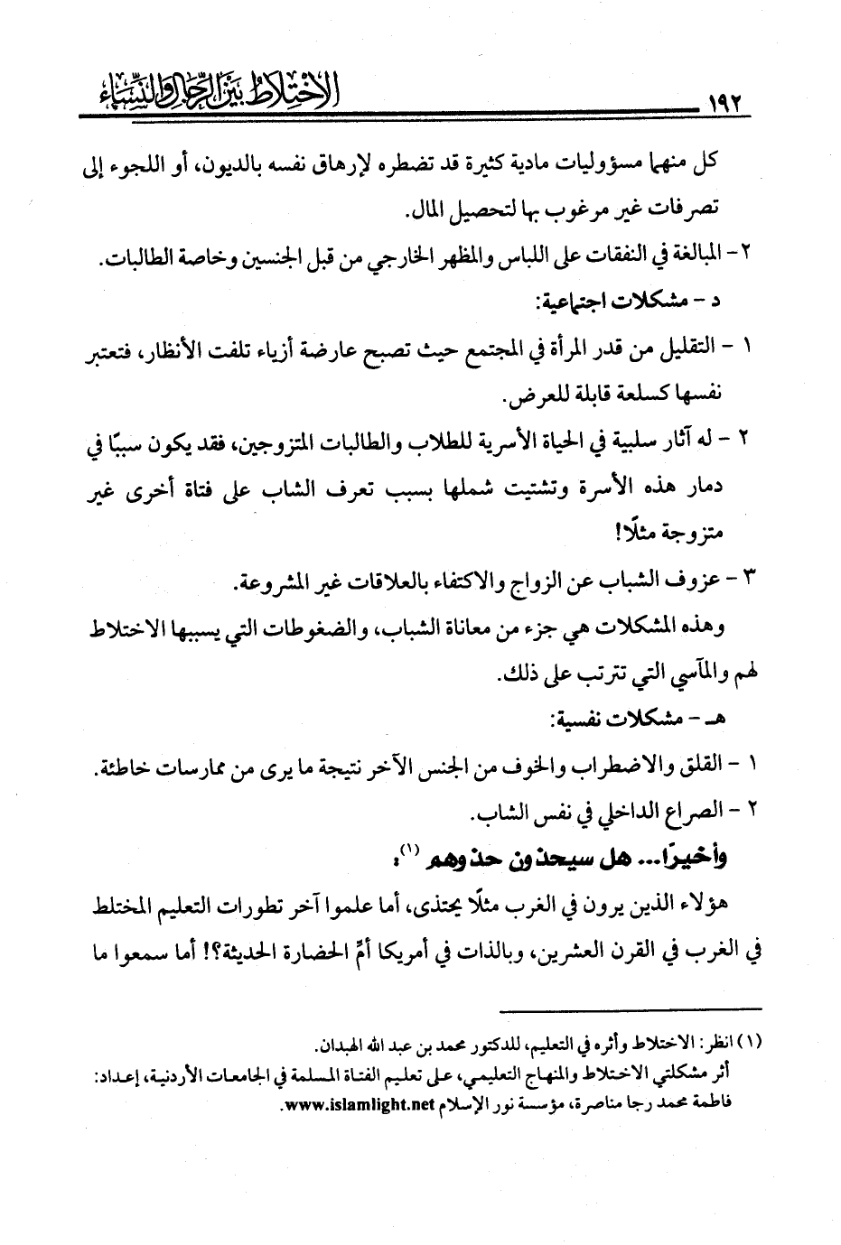 أثر مشكلتي الاختلاط والمنهاج التعليمي، على تعليم الفتاة المسلمة في الجامعات الأردنية، إعداد: فاطمة محمد رجا مناصره، مؤسسة نور الاسلام www.islamlight.net.