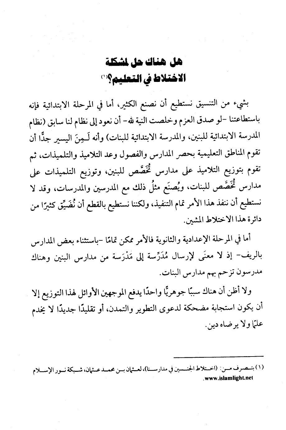(¬1) بتصرف من (اختلاط الجنسين في مدارسنا)، لعثمان بن محمد عثمان، شبكة نور الإسلام www.islamlight.net.