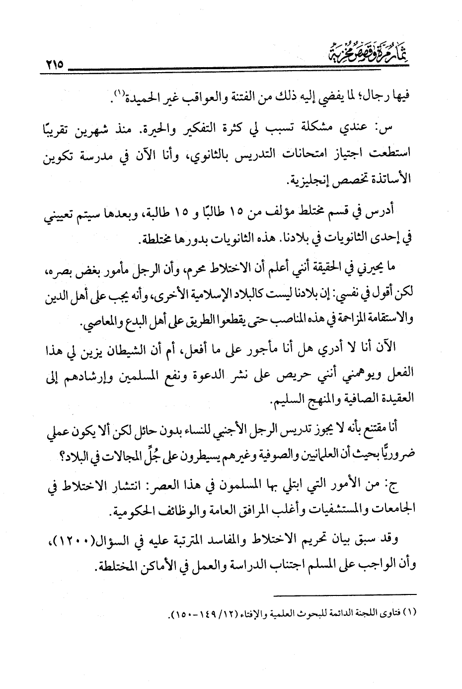 أنا مقتنع بأنه لا يجوز تدريس الرجل الأجنبي للنساء بدون حائل لكن ألا يكون عملي ضروريًّا بحيث أن العلمانيين والصوفية وغيرهم يسيطرون على جُلّ المجالات في البلاد؟