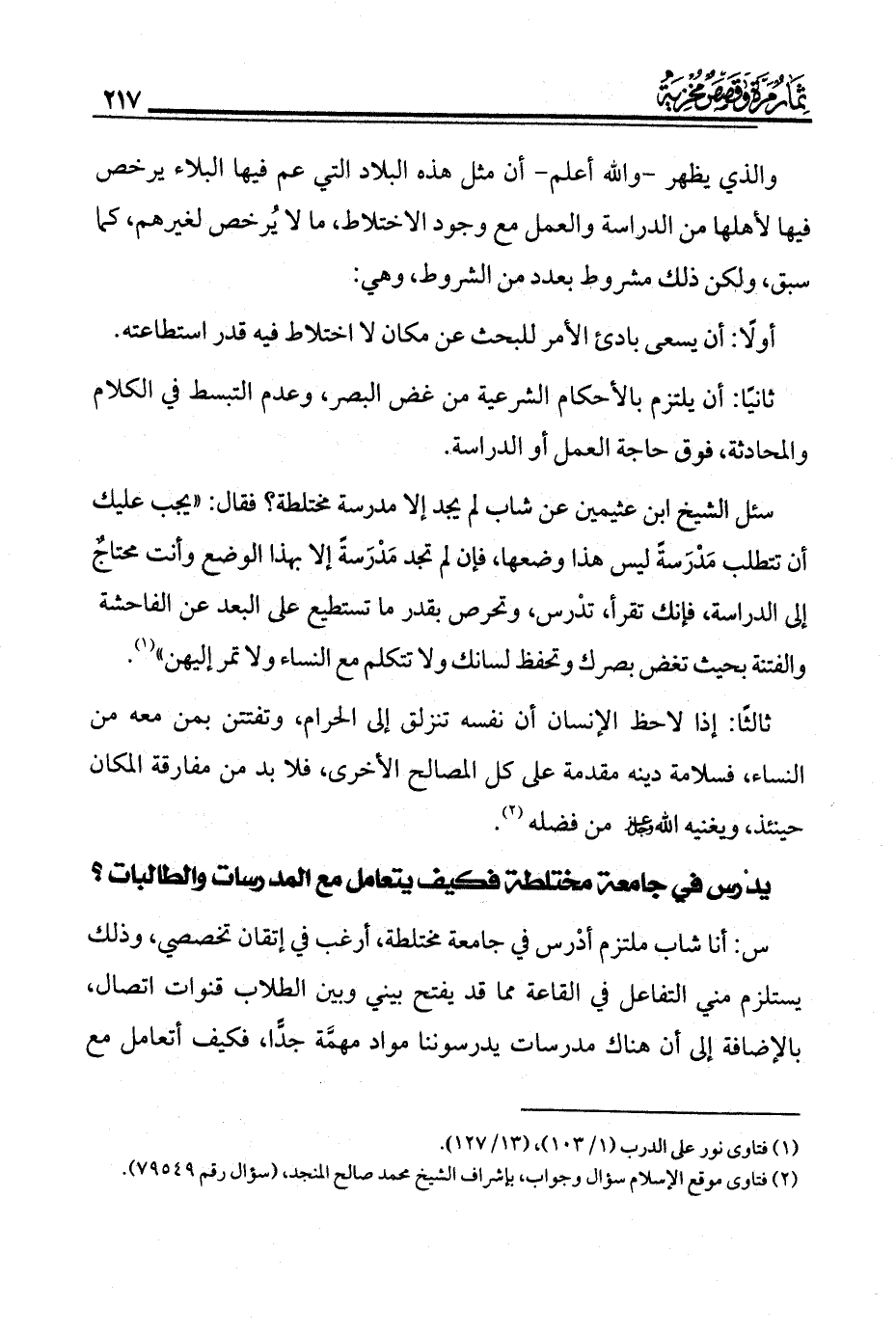 سئل الشيخ ابن عثيمين عن شاب لم يجد إلا مدرسة مختلطة؟ فقال: «يجب عليك أن تتطلب مَدْرَسةً ليس هذا وضعها، فإن لم تجد مَدْرَسةً إلا بهذا الوضع وأنت محتاجٌ إلى الدراسة، فإنك تقرأ، تدْرس، وتحرص بقدر ما تستطيع على البعد عن الفاحشة والفتنة بحيث تغض بصرك وتحفظ لسانك ولا تتكلم مع النساء ولا تمر إليهن» (¬1).