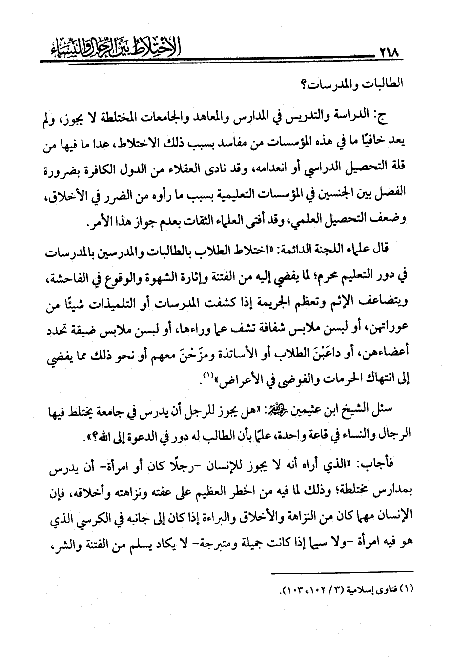 قال علماء اللجنة الدائمة: «اختلاط الطلاب بالطالبات والمدرسين بالمدرسات في دور التعليم محرم لما يفضي إليه من الفتنة وإثارة الشهوة والوقوع في الفاحشة، ويتضاعف الإثم وتعظم الجريمة إذا كشفت المدرسات أو التلميذات شيئًا من عوراتهن، أو لبسن ملابس شفافة تشف عما وراءها، أو لبسن ملابس ضيقة تحدد أعضاءهن، أو داعَبْنَ الطلاب أو الأساتذة ومزَحْنَ معهم أو نحو ذلك مما يفضي إلى انتهاك الحرمات والفوضى في الأعراض» (¬1).