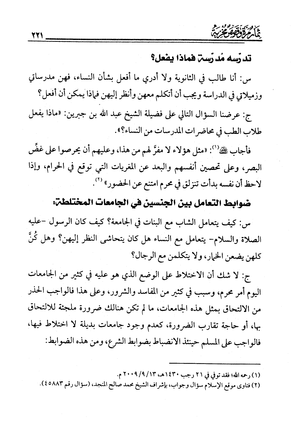 فأجاب ـ حفظه الله ـ (¬1): «مثل هؤلاء لا مفّر لهم من هذا، وعليهم أن يحرصوا على غضّ البصر، وعلى تحصين أنفسهم والبعد عن المغريات التي توقع في الحرام، وإذا لاحظ أن نفسه بدأت تنزلق في محرم امتنع عن الحضور» (¬2).