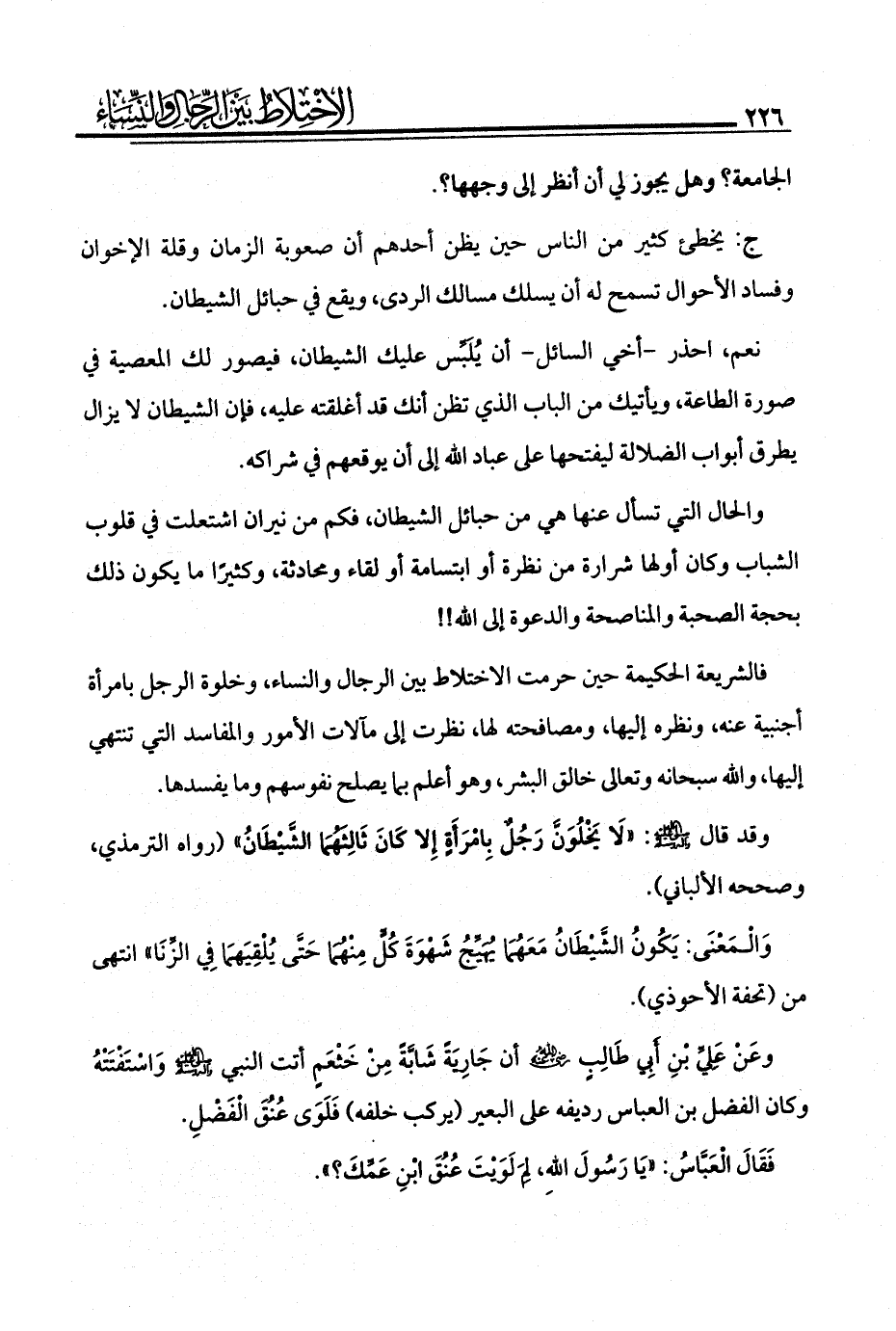 وعَنْ عَلِيِّ بْنِ أَبِي طَالِبٍ - رضي الله عنه - أن جَارِيَةً شَابَّةً مِنْ خَثْعَمٍ أتت النبي - صلى الله عليه وآله وسلم - وَاسْتَفْتَتْهُ وكان الفضل بن العباس رديفه على البعير (يركب خلفه) فَلَوَى عُنُقَ الْفَضْلِ.