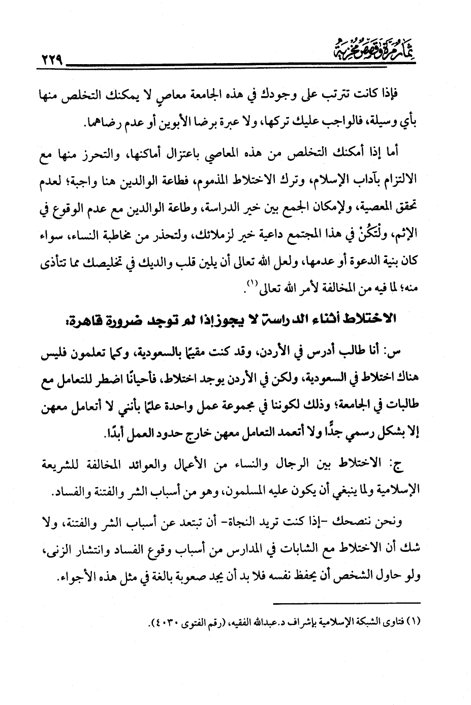 س: أنا طالب أدرس في الأردن، وقد كنت مقيمًا بالسعودية، وكما تعلمون فليس هناك اختلاط في السعودية، ولكن في الأردن يوجد اختلاط، فأحيانًا اضطر للتعامل مع طالبات في الجامعة وذلك لكوننا في مجموعة عمل واحدة علما بأنني لا أتعامل معهن إلا بشكل رسمي جدًا ولا أتعمد التعامل معهن خارج حدود العمل أبدًا.