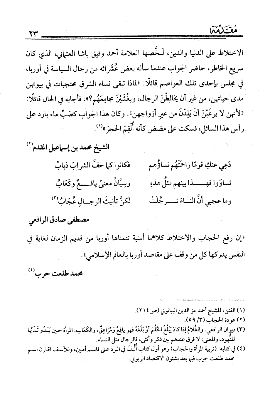 (¬4) في كتابه (تربية المرأة والحجاب) وهو أول كتاب ألِّفَ في الرد على قاسم أمين، وللأسف اقترن اسم محمد طلعت حرب فيما بعد بشئون الاقتصاد الربوي.