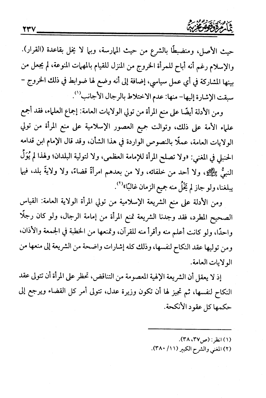 حيث الأصل، ومنضبطًا بالشرع من حيث الممارسة، وبما لا يخل بقاعدة (القرار). والإسلام رغم أنه أباح للمرأة الخروج من المنزل للقيام بالمهمات المنوعة، لم يجعل من بينها المشاركة في أي عمل سياسي، إضافة إلى أنه وضع لها ضوابط في ذلك الخروج ـ سبقت الإشارة إليها ـ منها عدم الاختلاط بالرجال الأجانب (¬1).