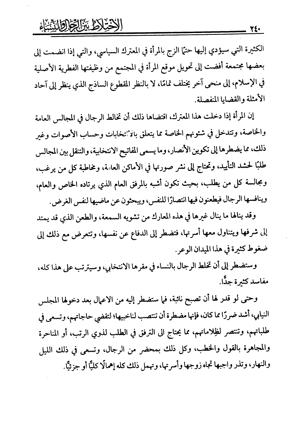 إن المرأة إذا دخلت هذا المعترك، اقتضاها ذلك أن تخالط الرجال في المجالس العامة والخاصة، وتتدخل في شئونهم الخاصة مما يتعلق بالانتخابات وحساب الأصوات وغير ذلك، مما يضطرها إلى تكوين الأنصار وما يسمى المفاتيح الانتخابية، والتنقل بين المجالس طلبًا لحشد التأييد، وتحتاج إلى نشر صورتها في الأماكن العامة، ومخاطبة كل من يرغب، ومجالسة كل من يطلب، بحيث تكون أشبه بالمرفق العام الذي يرتاده الخاص والعام، وينافسها الرجال فيطعنون فيها انتصارًا للنفس، ويبحثون عن ماضيها لنفس الغرض.