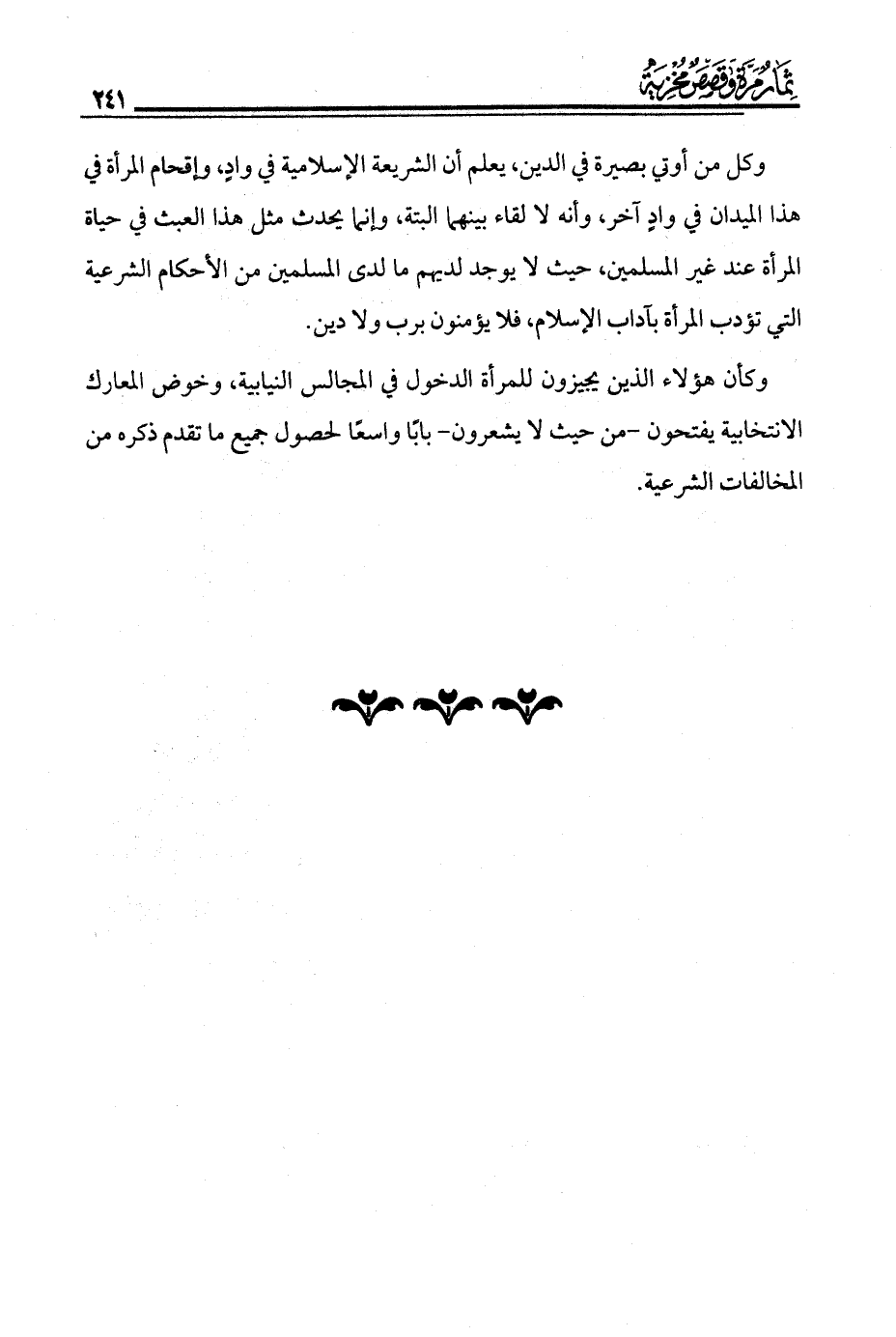 وكأن هؤلاء الذين يجيزون للمرأة الدخول في المجالس النيابية، وخوض المعارك الانتخابية ـ يفتحون من حيث لا يشعرون ـ بابًا واسعًا لحصول جميع ما تقدم ذكره من المخالفات الشرعية.