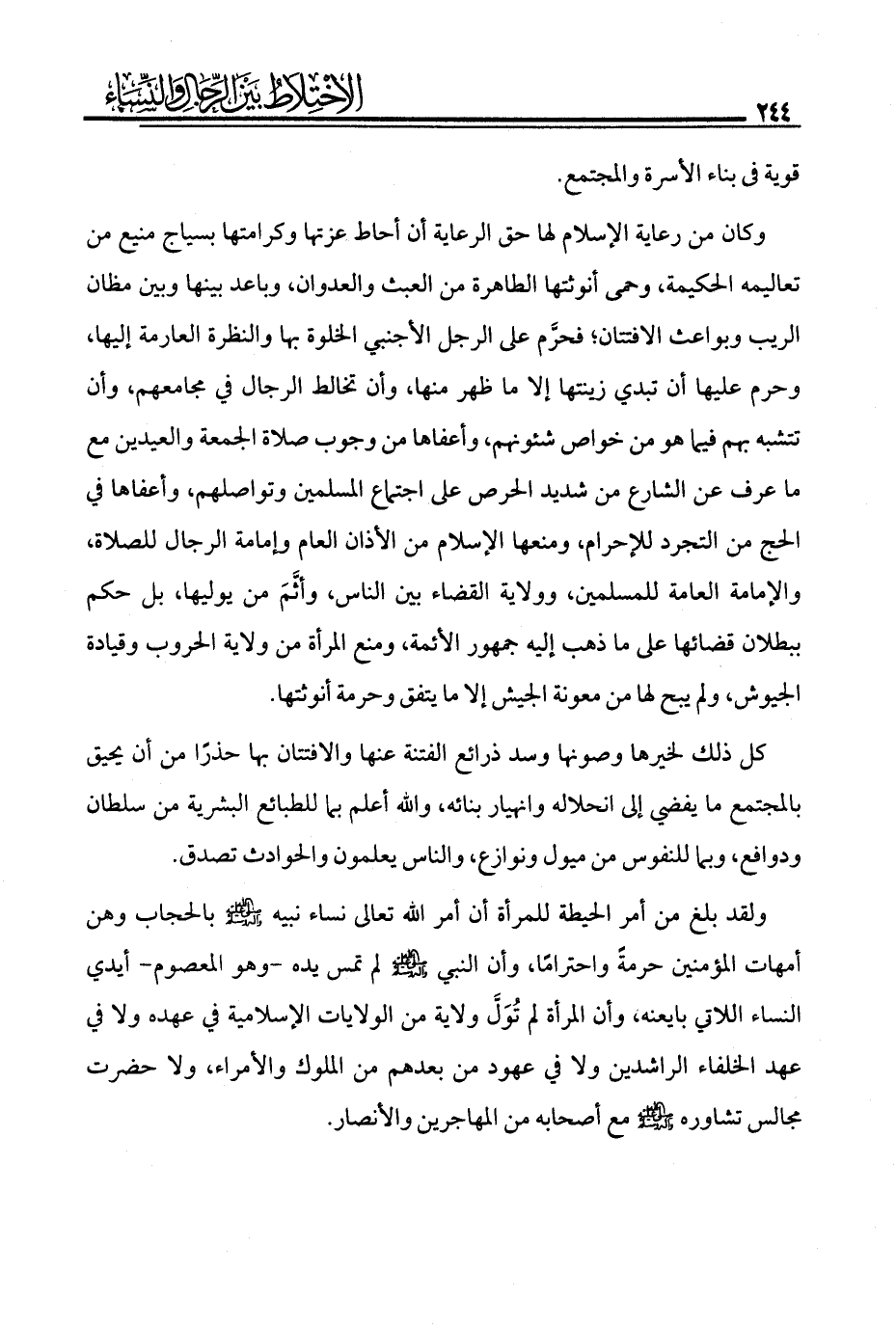 وكان من رعاية الإسلام لها حق الرعاية أن أحاط عزتها وكرامتها بسياج منيع من تعاليمه الحكيمة، وحمى أنوثتها الطاهرة من العبث والعدوان، وباعد بينها وبين مظان الريب وبواعث الافتتان؛ فحرم على الرجل الأجنبى الخلوة بها والنظرة العارمة إليها، وحرم عليها أن تبدى زينتها إلا ما ظهر منها، وأن تخالط الرجال فى مجامعهم، وأن تتشبه بهم فيما هو من خواص شئونهم، وأعفاها من وجوب صلاة الجمعة والعيدين مع ما عرف عن الشارع من شديد الحرص على اجتماع المسلمين وتواصلهم، وأعفاها فى الحج من التجرد للإحرام، ومنعها الإسلام من الأذان العام وإمامة الرجال للصلاة، والإمامة العامة للمسلمين، وولاية القضاء بين الناس، وأثَّمَ من يوليها بل حكم ببطلان قضائها على ما ذهب إليه جمهور الأئمة، ومنع المرأة من ولاية الحروب وقيادة الجيوش، ولم يبح لها من معونة الجيش إلا ما يتفق وحرمة أنوثتها.