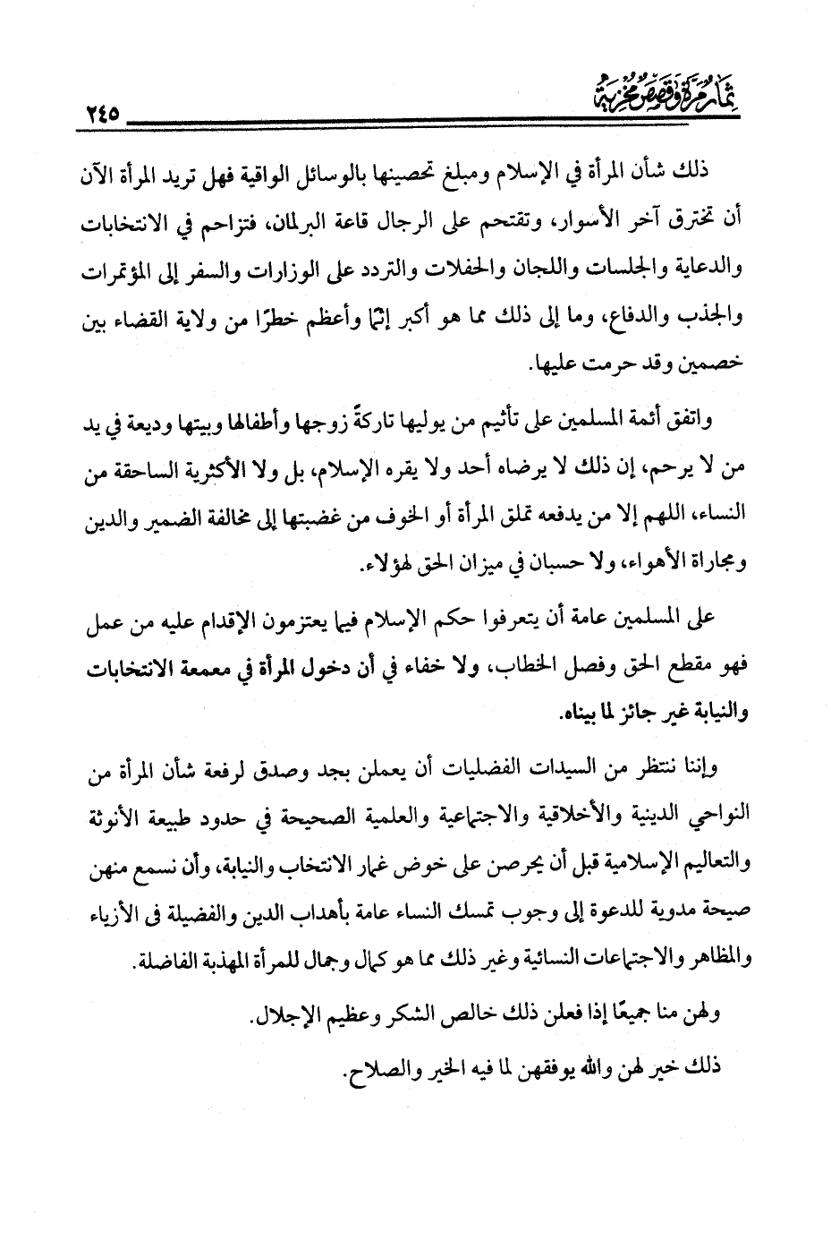 على المسلمين عامة أن يتعرفوا حكم الإسلام فيما يعتزمون الإقدام عليه من عمل فهو مقطع الحق وفصل الخطاب، ولا خفاء فى أن دخول المرأة فى معمعة الانتخابات والنيابة غير جائز لما بيناه.