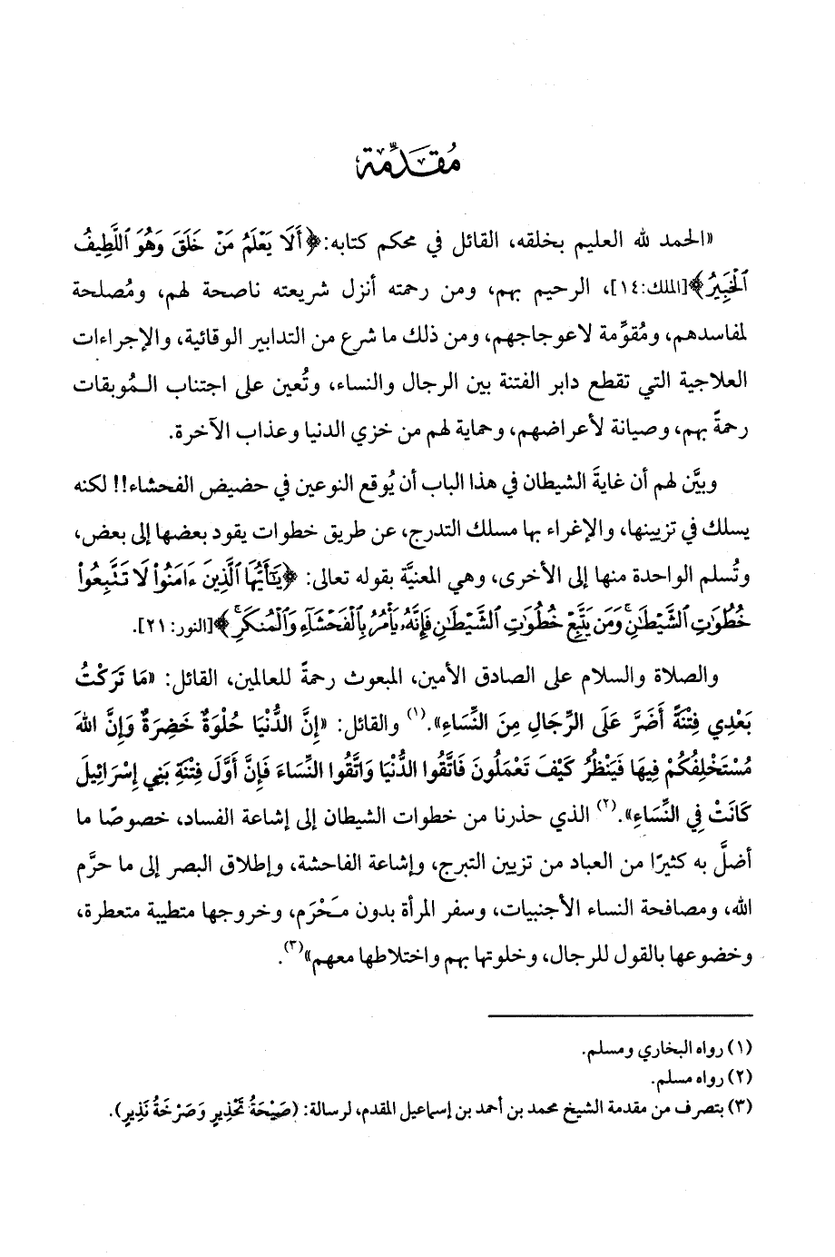 والصلاة والسلام على الصادق الأمين , المبعوث رحمةً للعالمين ـ القائل: «مَا تَرَكْتُ بَعْدِى فِتْنَةً أَضَرَّ عَلَى الرِّجَالِ مِنَ النِّسَاءِ» (¬1).والقائل: «إِنَّ الدُّنْيَا حُلْوَةٌ خَضِرَةٌ وَإِنَّ اللهَ مُسْتَخْلِفُكُمْ فِيهَا فَيَنْظُرُ كَيْفَ تَعْمَلُونَ فَاتَّقُوا الدُّنْيَا وَاتَّقُوا النِّسَاءَ فَإِنَّ أَوَّلَ فِتْنَةِ بَنِى إِسْرَائِيلَ كَانَتْ فِى النِّسَاءِ» (¬2) ـ الذي حذرنا من خطوات الشيطان إلى إشاعة الفساد , خصوصًا ما أضلَّ به كثيرًا من العباد من تزيين التبرج، وإشاعة الفاحشة، وإطلاق البصر إلى ما حرَّم الله، ومصافحة النساء الأجنبيات، وسفر المرأة بدون مَحرَم، وخروجها متطيبة متعطرة , وخضوعها بالقول للرجال، وخلوتها بهم واختلاطها معهم» (¬3).