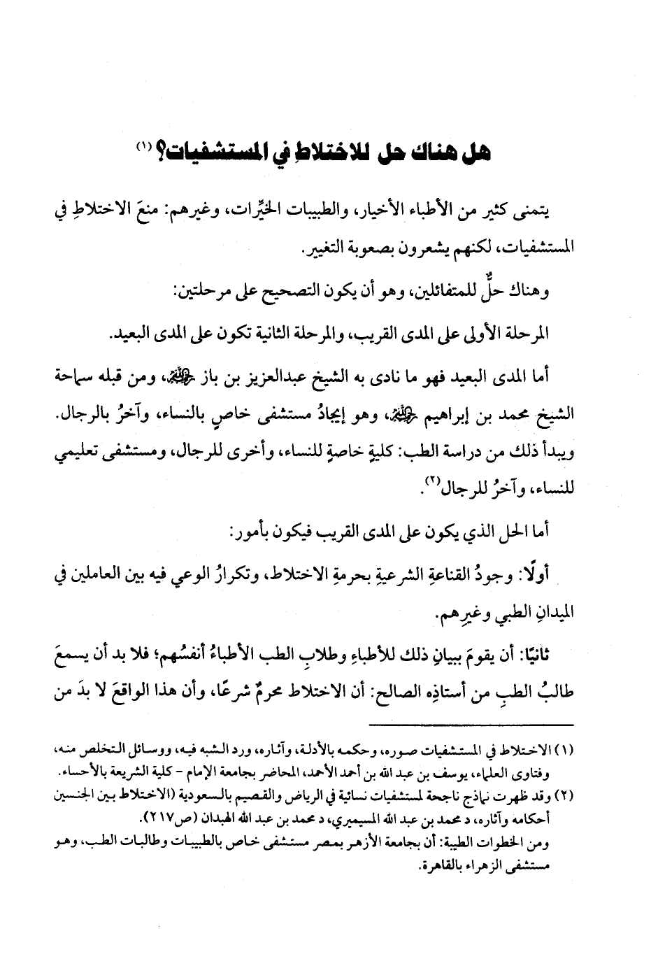 (¬2) وقد ظهرت نماذج ناجحة لمستشفيات نسائية في الرياض والقصيم بالسعودية، (الاختلاط بين الجنسين أحكامه وآثاره، د محمد بن عبد الله المسيميري، د محمد بن عبد الله الهبدان (ص217).