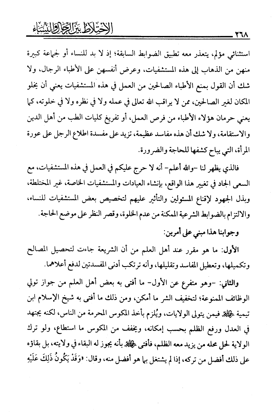 استثنائي مؤلم، يتعذر معه تطبيق الضوابط السابقة؛ إذ لابد للنساء أو لجماعة كبيرة منهن من الذهاب إلى هذه المستشفيات، وعرض أنفسهن على الأطباء الرجال، ولا شك أن القول بمنع الأطباء الصالحين من العمل في هذه المستشفيات، يعني أن يخلو المكان لغير الصالحين، ممن لا يراقب الله تعالى في عمله ولا في نظره ولا في خلوته، كما يعني حرمان هؤلاء الأطباء من فرص العمل، أو تفريغ كليات الطب من أهل الدين والاستقامة، ولاشك أن هذه مفاسد عظيمة، تزيد على مفسدة اطلاع الرجل على عورة المرأة، التي يباح كشفها للحاجة والضرورة.