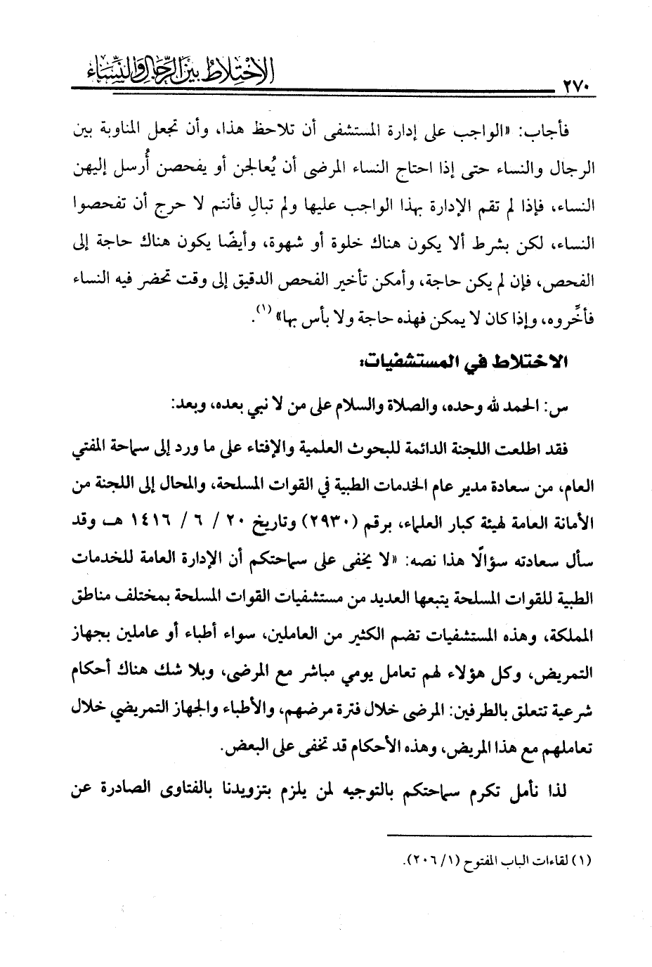 فقد اطلعت اللجنة الدائمة للبحوث العلمية والإفتاء على ما ورد إلى سماحة المفتي العام، من سعادة مدير عام الخدمات الطبية في القوات المسلحة، والمحال إلى اللجنة من الأمانة العامة لهيئة كبار العلماء، برقم (2930) وتاريخ 20/ 6 / 1416 هـ , وقد سأل سعادته سؤالا هذا نصه: «لا يخفى على سماحتكم أن الإدارة العامة للخدمات الطبية للقوات المسلحة، يتبعها العديد من مستشفيات القوات المسلحة بمختلف مناطق المملكة، وهذه المستشفيات تضم الكثير من العاملين، سواء أطباء أو عاملين بجهاز التمريض، وكل هؤلاء لهم تعامل يومي مباشر مع المرضى، وبلا شك هناك أحكام شرعية تتعلق بالطرفين: المرضى خلال فترة مرضهم، والأطباء والجهاز التمريضي خلال تعاملهم مع هذا المريض، وهذه الأحكام قد تخفى على البعض.