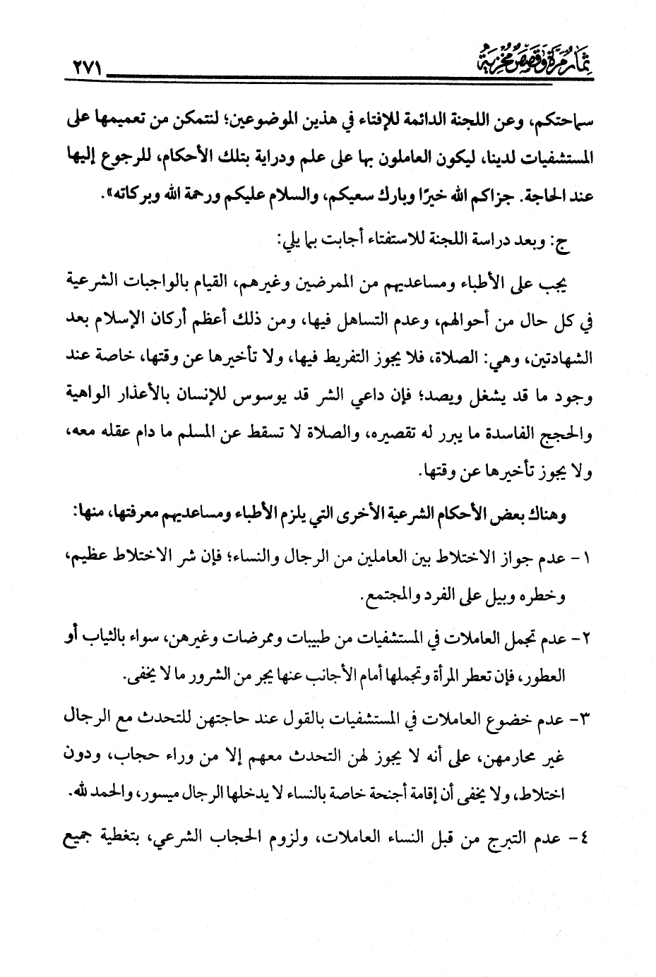 2 - عدم تجمل العاملات في المستشفيات من طبيبات وممرضات وغيرهن، سواء بالثياب أو العطور، فإن تعطر المرأة وتجملها أمام الأجانب عنها يجر من الشرور ما لا يخفى.
