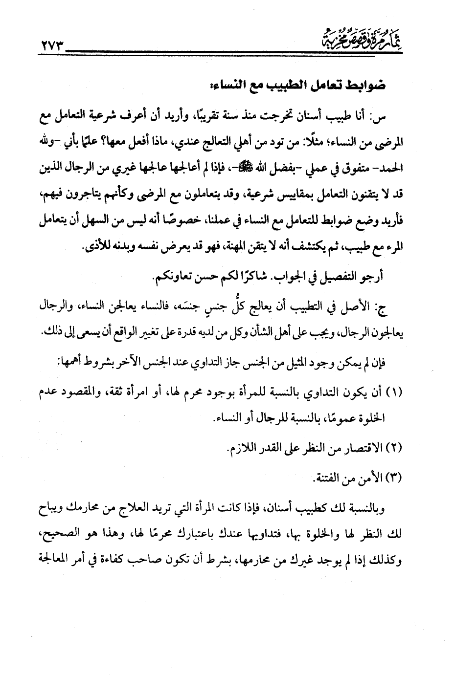 (1) أن يكون التداوي بالنسبة للمرأة بوجود محرم لها، أو امرأة ثقة، والمقصود عدم الخلوة عمومًا، بالنسبة للرجال أو النساء.